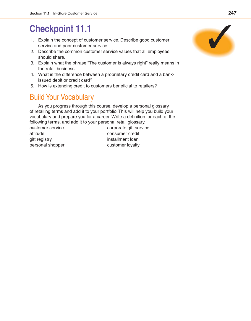 247 Section 11.1 In-Store Customer Service Checkpoint 11.1 1. Explain the concept of customer service. Describe good customer service and poor customer service. 2. Describe the common customer service values that all employees should share. 3. Explain what the phrase “The customer is always right” really means in the retail business. 4. What is the difference between a proprietary credit card and a bank- issued debit or credit card? 5. How is extending credit to customers benefi cial to retailers? Build Your Vocabulary As you progress through this course, develop a personal glossary of retailing terms and add it to your portfolio. This will help you build your vocabulary and prepare you for a career. Write a defi nition for each of the following terms, and add it to your personal retail glossary. customer service attitude gift registry personal shopper corporate gift service consumer credit installment loan customer loyalty ✓