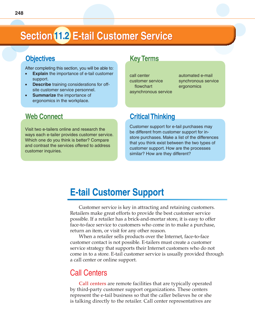 248 Key Terms Objectives Critical Thinking Web Connect Section E-tail Customer Service 11.2 After completing this section, you will be able to: • Explain the importance of e-tail customer support. • Describe training considerations for off- site customer service personnel. • Summarize the importance of ergonomics in the workplace. call center customer service fl owchart asynchronous service automated e-mail synchronous service ergonomics Visit two e-tailers online and research the ways each e-tailer provides customer service. Which one do you think is better? Compare and contrast the services offered to address customer inquiries. Customer support for e-tail purchases may be different from customer support for in- store purchases. Make a list of the differences that you think exist between the two types of customer support. How are the processes similar? How are they different? E-tail Customer Support Customer service is key in attracting and retaining customers. Retailers make great efforts to provide the best customer service possible. If a retailer has a brick-and-mortar store, it is easy to offer face-to-face service to customers who come in to make a purchase, return an item, or visit for any other reason. When a retailer sells products over the Internet, face-to-face customer contact is not possible. E-tailers must create a customer service strategy that supports their Internet customers who do not come in to a store. E-tail customer service is usually provided through a call center or online support. Call Centers Call centers are remote facilities that are typically operated by third-party customer support organizations. These centers represent the e-tail business so that the caller believes he or she is talking directly to the retailer. Call center representatives are