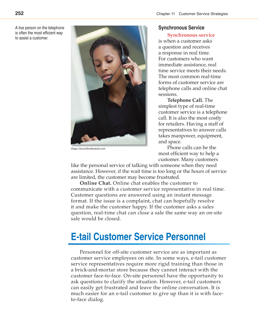 252 Chapter 11 Customer Service Strategies Synchronous Service Synchronous service is when a customer asks a question and receives a response in real time. For customers who want immediate assistance, real time service meets their needs. The most common real-time forms of customer service are telephone calls and online chat sessions. Telephone Call. The simplest type of real-time customer service is a telephone call. It is also the most costly for retailers. Having a staff of representatives to answer calls takes manpower, equipment, and space. Phone calls can be the most effi cient way to help a customer. Many customers like the personal service of talking with someone when they need assistance. However, if the wait time is too long or the hours of service are limited, the customer may become frustrated. Online Chat. Online chat enables the customer to communicate with a customer service representative in real time. Customer questions are answered using an instant message format. If the issue is a complaint, chat can hopefully resolve it and make the customer happy. If the customer asks a sales question, real-time chat can close a sale the same way an on-site sale would be closed. E-tail Customer Service Personnel Personnel for off-site customer service are as important as customer service employees on site. In some ways, e-tail customer service representatives require more rigid training than those in a brick-and-mortar store because they cannot interact with the customer face-to-face. On-site personnel have the opportunity to ask questions to clarify the situation. However, e-tail customers can easily get frustrated and leave the online conversation. It is much easier for an e-tail customer to give up than it is with face- to-face dialog. A live person on the telephone is often the most effi cient way to assist a customer. Diego Cervo/Shutterstock.com