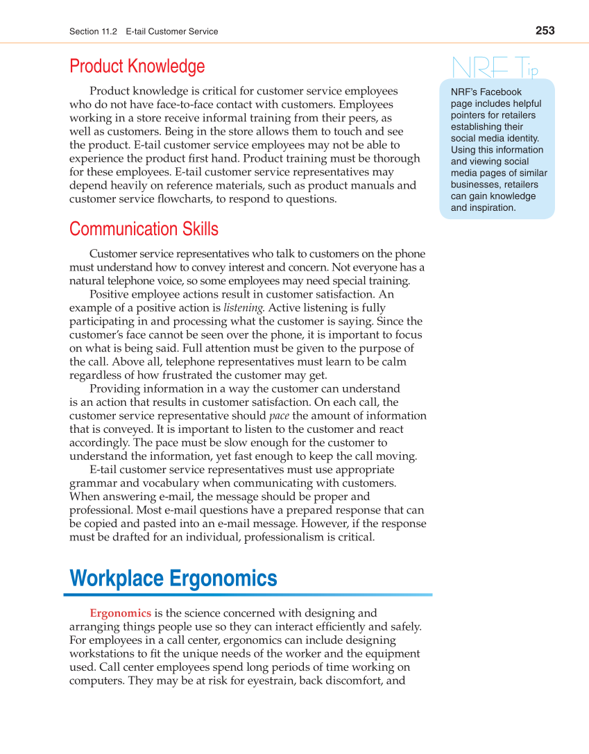 253 Section 11.2 E-tail Customer Service Product Knowledge Product knowledge is critical for customer service employees who do not have face-to-face contact with customers. Employees working in a store receive informal training from their peers, as well as customers. Being in the store allows them to touch and see the product. E-tail customer service employees may not be able to experience the product fi rst hand. Product training must be thorough for these employees. E-tail customer service representatives may depend heavily on reference materials, such as product manuals and customer service fl owcharts, to respond to questions. Communication Skills Customer service representatives who talk to customers on the phone must understand how to convey interest and concern. Not everyone has a natural telephone voice, so some employees may need special training. Positive employee actions result in customer satisfaction. An example of a positive action is listening. Active listening is fully participating in and processing what the customer is saying. Since the customer’s face cannot be seen over the phone, it is important to focus on what is being said. Full attention must be given to the purpose of the call. Above all, telephone representatives must learn to be calm regardless of how frustrated the customer may get. Providing information in a way the customer can understand is an action that results in customer satisfaction. On each call, the customer service representative should pace the amount of information that is conveyed. It is important to listen to the customer and react accordingly. The pace must be slow enough for the customer to understand the information, yet fast enough to keep the call moving. E-tail customer service representatives must use appropriate grammar and vocabulary when communicating with customers. When answering e-mail, the message should be proper and professional. Most e-mail questions have a prepared response that can be copied and pasted into an e-mail message. However, if the response must be drafted for an individual, professionalism is critical. Workplace Ergonomics Ergonomics is the science concerned with designing and arranging things people use so they can interact effi ciently and safely. For employees in a call center, ergonomics can include designing workstations to fi t the unique needs of the worker and the equipment used. Call center employees spend long periods of time working on computers. They may be at risk for eyestrain, back discomfort, and NRF Tip NRF’s Facebook page includes helpful pointers for retailers establishing their social media identity. Using this information and viewing social media pages of similar businesses, retailers can gain knowledge and inspiration.