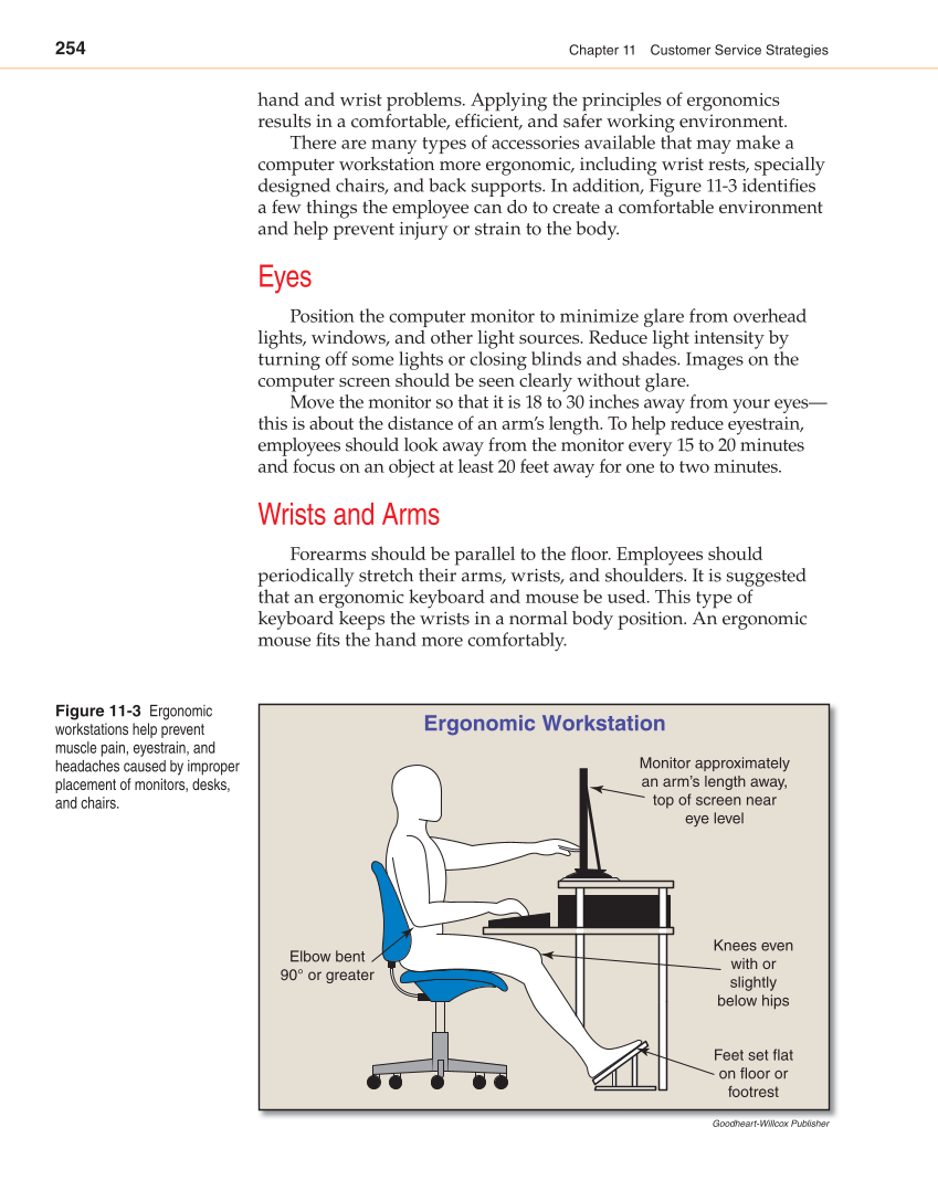 254 Chapter 11 Customer Service Strategies hand and wrist problems. Applying the principles of ergonomics results in a comfortable, effi cient, and safer working environment. There are many types of accessories available that may make a computer workstation more ergonomic, including wrist rests, specially designed chairs, and back supports. In addition, Figure 11-3 identifi es a few things the employee can do to create a comfortable environment and help prevent injury or strain to the body. Eyes Position the computer monitor to minimize glare from overhead lights, windows, and other light sources. Reduce light intensity by turning off some lights or closing blinds and shades. Images on the computer screen should be seen clearly without glare. Move the monitor so that it is 18 to 30 inches away from your eyes— this is about the distance of an arm’s length. To help reduce eyestrain, employees should look away from the monitor every 15 to 20 minutes and focus on an object at least 20 feet away for one to two minutes. Wrists and Arms Forearms should be parallel to the fl oor. Employees should periodically stretch their arms, wrists, and shoulders. It is suggested that an ergonomic keyboard and mouse be used. This type of keyboard keeps the wrists in a normal body position. An ergonomic mouse fi ts the hand more comfortably. Figure 11-3 Ergonomic workstations help prevent muscle pain, eyestrain, and headaches caused by improper placement of monitors, desks, and chairs. Monitor approximately an arm’s length away, top of screen near eye level Knees even with or slightly below hips Feet set flat on floor or footrest Elbow bent 90° or greater Ergonomic Workstation Goodheart-Willcox Publisher