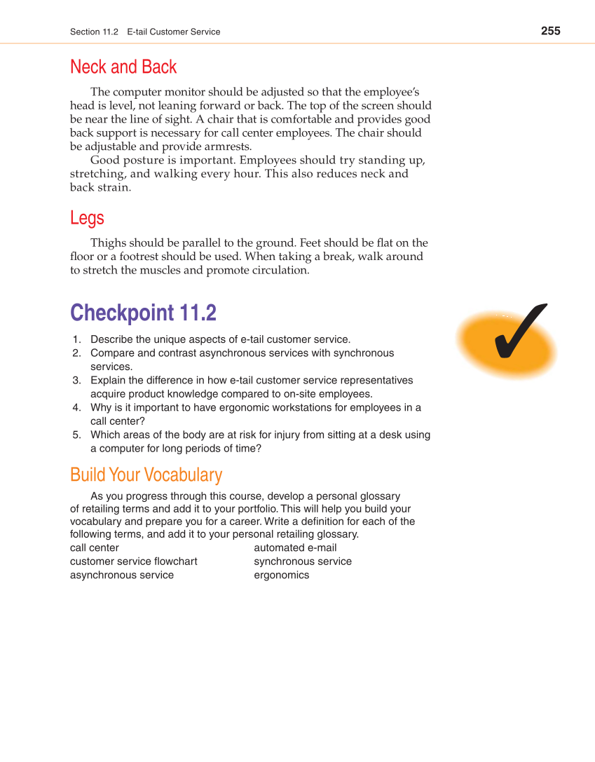 255 Section 11.2 E-tail Customer Service Neck and Back The computer monitor should be adjusted so that the employee’s head is level, not leaning forward or back. The top of the screen should be near the line of sight. A chair that is comfortable and provides good back support is necessary for call center employees. The chair should be adjustable and provide armrests. Good posture is important. Employees should try standing up, stretching, and walking every hour. This also reduces neck and back strain. Legs Thighs should be parallel to the ground. Feet should be fl at on the fl oor or a footrest should be used. When taking a break, walk around to stretch the muscles and promote circulation. Checkpoint 11.2 1. Describe the unique aspects of e-tail customer service. 2. Compare and contrast asynchronous services with synchronous services. 3. Explain the difference in how e-tail customer service representatives acquire product knowledge compared to on-site employees. 4. Why is it important to have ergonomic workstations for employees in a call center? 5. Which areas of the body are at risk for injury from sitting at a desk using a computer for long periods of time? Build Your Vocabulary As you progress through this course, develop a personal glossary of retailing terms and add it to your portfolio. This will help you build your vocabulary and prepare you for a career. Write a defi nition for each of the following terms, and add it to your personal retailing glossary. call center customer service fl owchart asynchronous service automated e-mail synchronous service ergonomics ✓