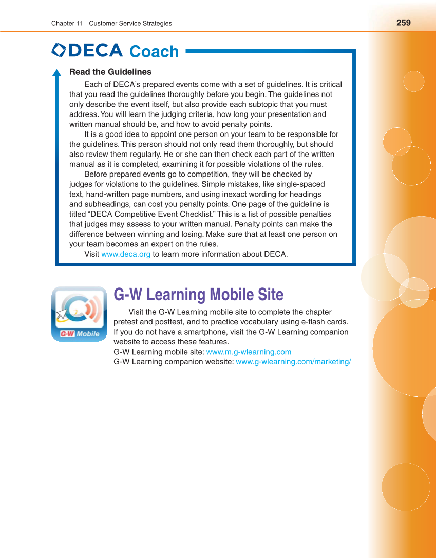 Chapter 11 Customer Service Strategies 259 G-W Learning Mobile Site Visit the G-W Learning mobile site to complete the chapter pretest and posttest, and to practice vocabulary using e-fl ash cards. If you do not have a smartphone, visit the G-W Learning companion website to access these features. G-W Learning mobile site: www.m.g-wlearning.com G-W Learning companion website: www.g-wlearning.com/marketing/ Coach Read the Guidelines Each of DECA’s prepared events come with a set of guidelines. It is critical that you read the guidelines thoroughly before you begin. The guidelines not only describe the event itself, but also provide each subtopic that you must address. You will learn the judging criteria, how long your presentation and written manual should be, and how to avoid penalty points. It is a good idea to appoint one person on your team to be responsible for the guidelines. This person should not only read them thoroughly, but should also review them regularly. He or she can then check each part of the written manual as it is completed, examining it for possible violations of the rules. Before prepared events go to competition, they will be checked by judges for violations to the guidelines. Simple mistakes, like single-spaced text, hand-written page numbers, and using inexact wording for headings and subheadings, can cost you penalty points. One page of the guideline is titled “DECA Competitive Event Checklist.” This is a list of possible penalties that judges may assess to your written manual. Penalty points can make the difference between winning and losing. Make sure that at least one person on your team becomes an expert on the rules. Visit www.deca.org to learn more information about DECA.