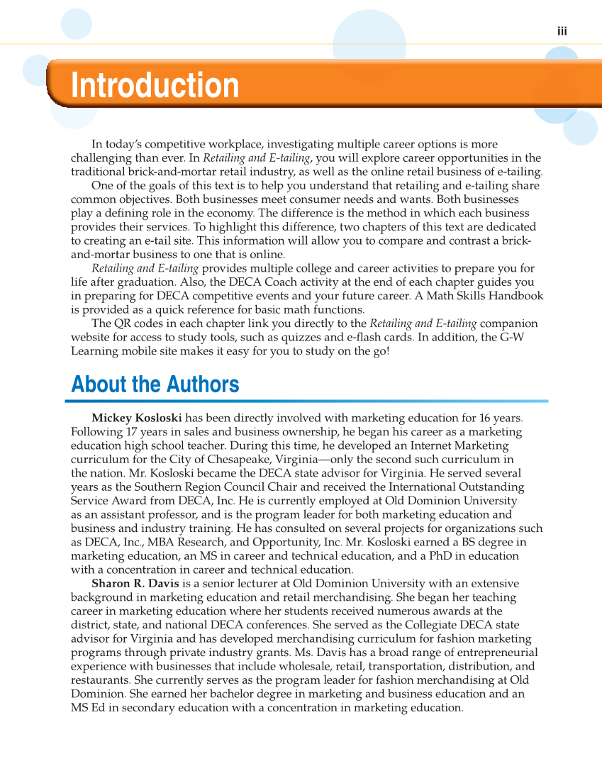 iii Introduction In today’s competitive workplace, investigating multiple career options is more challenging than ever. In Retailing and E-tailing, you will explore career opportunities in the traditional brick-and-mortar retail industry, as well as the online retail business of e-tailing. One of the goals of this text is to help you understand that retailing and e-tailing share common objectives. Both businesses meet consumer needs and wants. Both businesses play a defi ning role in the economy. The difference is the method in which each business provides their services. To highlight this difference, two chapters of this text are dedicated to creating an e-tail site. This information will allow you to compare and contrast a brick- and-mortar business to one that is online. Retailing and E-tailing provides multiple college and career activities to prepare you for life after graduation. Also, the DECA Coach activity at the end of each chapter guides you in preparing for DECA competitive events and your future career. A Math Skills Handbook is provided as a quick reference for basic math functions. The QR codes in each chapter link you directly to the Retailing and E-tailing companion website for access to study tools, such as quizzes and e-fl ash cards. In addition, the G-W Learning mobile site makes it easy for you to study on the go! About the Authors Mickey Kosloski has been directly involved with marketing education for 16 years. Following 17 years in sales and business ownership, he began his career as a marketing education high school teacher. During this time, he developed an Internet Marketing curriculum for the City of Chesapeake, Virginia—only the second such curriculum in the nation. Mr. Kosloski became the DECA state advisor for Virginia. He served several years as the Southern Region Council Chair and received the International Outstanding Service Award from DECA, Inc. He is currently employed at Old Dominion University as an assistant professor, and is the program leader for both marketing education and business and industry training. He has consulted on several projects for organizations such as DECA, Inc., MBA Research, and Opportunity, Inc. Mr. Kosloski earned a BS degree in marketing education, an MS in career and technical education, and a PhD in education with a concentration in career and technical education. Sharon R. Davis is a senior lecturer at Old Dominion University with an extensive background in marketing education and retail merchandising. She began her teaching career in marketing education where her students received numerous awards at the district, state, and national DECA conferences. She served as the Collegiate DECA state advisor for Virginia and has developed merchandising curriculum for fashion marketing programs through private industry grants. Ms. Davis has a broad range of entrepreneurial experience with businesses that include wholesale, retail, transportation, distribution, and restaurants. She currently serves as the program leader for fashion merchandising at Old Dominion. She earned her bachelor degree in marketing and business education and an MS Ed in secondary education with a concentration in marketing education.