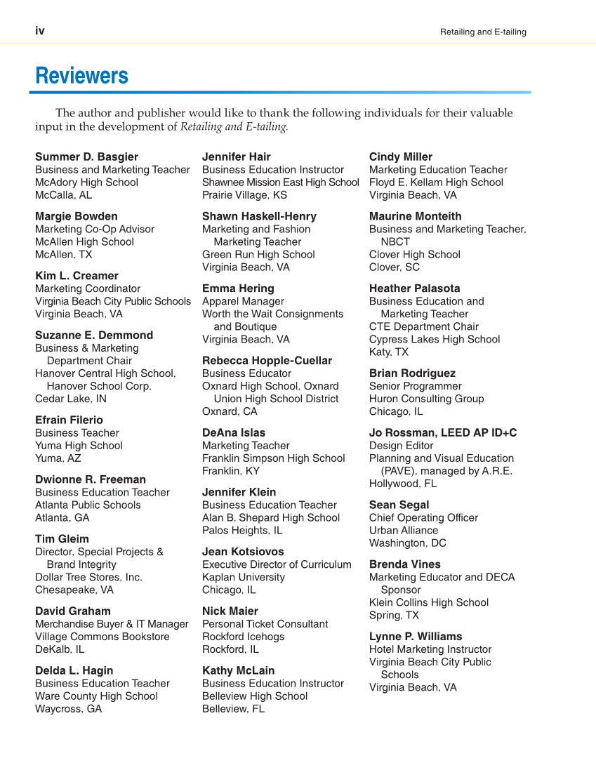 iv Retailing and E-tailing Reviewers Summer D. Basgier Business and Marketing Teacher McAdory High School McCalla, AL Margie Bowden Marketing Co-Op Advisor McAllen High School McAllen, TX Kim L. Creamer Marketing Coordinator Virginia Beach City Public Schools Virginia Beach, VA Suzanne E. Demmond Business & Marketing Department Chair Hanover Central High School, Hanover School Corp. Cedar Lake, IN Efrain Filerio Business Teacher Yuma High School Yuma, AZ Dwionne R. Freeman Business Education Teacher Atlanta Public Schools Atlanta, GA Tim Gleim Director, Special Projects & Brand Integrity Dollar Tree Stores, Inc. Chesapeake, VA David Graham Merchandise Buyer & IT Manager Village Commons Bookstore DeKalb, IL Delda L. Hagin Business Education Teacher Ware County High School Waycross, GA Jennifer Hair Business Education Instructor Shawnee Mission East High School Prairie Village, KS Shawn Haskell-Henry Marketing and Fashion Marketing Teacher Green Run High School Virginia Beach, VA Emma Hering Apparel Manager Worth the Wait Consignments and Boutique Virginia Beach, VA Rebecca Hopple-Cuellar Business Educator Oxnard High School, Oxnard Union High School District Oxnard, CA DeAna Islas Marketing Teacher Franklin Simpson High School Franklin, KY Jennifer Klein Business Education Teacher Alan B. Shepard High School Palos Heights, IL Jean Kotsiovos Executive Director of Curriculum Kaplan University Chicago, IL Nick Maier Personal Ticket Consultant Rockford Icehogs Rockford, IL Kathy McLain Business Education Instructor Belleview High School Belleview, FL Cindy Miller Marketing Education Teacher Floyd E. Kellam High School Virginia Beach, VA Maurine Monteith Business and Marketing Teacher, NBCT Clover High School Clover, SC Heather Palasota Business Education and Marketing Teacher CTE Department Chair Cypress Lakes High School Katy, TX Brian Rodriguez Senior Programmer Huron Consulting Group Chicago, IL Jo Rossman, LEED AP ID+C Design Editor Planning and Visual Education (PAVE), managed by A.R.E. Hollywood, FL Sean Segal Chief Operating Officer Urban Alliance Washington, DC Brenda Vines Marketing Educator and DECA Sponsor Klein Collins High School Spring, TX Lynne P. Williams Hotel Marketing Instructor Virginia Beach City Public Schools Virginia Beach, VA The author and publisher would like to thank the following individuals for their valuable input in the development of Retailing and E-tailing.