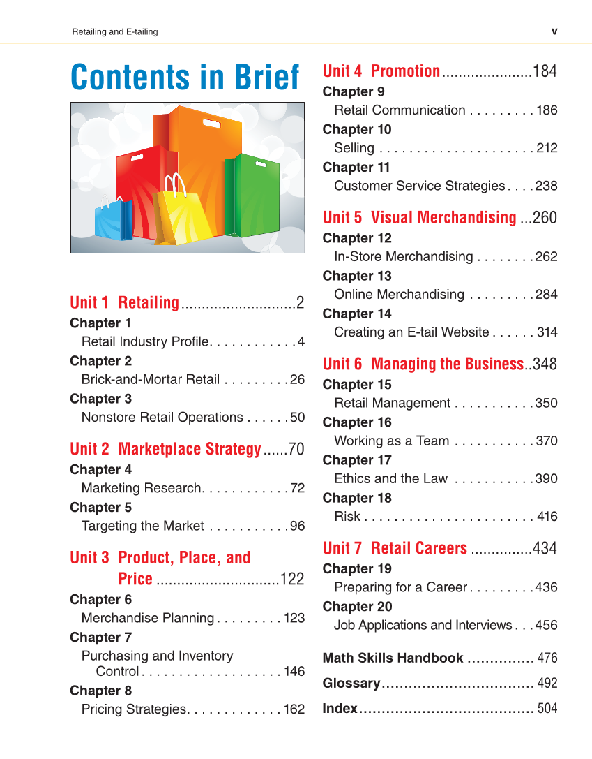 v Retailing and E-tailing Contents in Brief Unit 4 Promotion ......................184 Chapter 9 Retail Communication . . . . . . . . . 186 Chapter 10 Selling . . . . . . . . . . . . . . . . . . . . . 212 Chapter 11 Customer Service Strategies. . . .238 Unit 5 Visual Merchandising ...260 Chapter 12 In-Store Merchandising . . . . . . . .262 Chapter 13 Online Merchandising . . . . . . . . .284 Chapter 14 Creating an E-tail Website . . . . . . 314 Unit 6 Managing the Business ..348 Chapter 15 Retail Management . . . . . . . . . . .350 Chapter 16 Working as a Team . . . . . . . . . . .370 Chapter 17 Ethics and the Law . . . . . . . . . . .390 Chapter 18 Risk . . . . . . . . . . . . . . . . . . . . . . . 416 Unit 7 Retail Careers ...............434 Chapter 19 Preparing for a Career . . . . . . . . .436 Chapter 20 Job Applications and Interviews. . .456 Math Skills Handbook ............... 476 Glossary .................................. 492 Index ....................................... 504 Unit 1 Retailing ............................2 Chapter 1 Retail Industry Profile. . . . . . . . . . . .4 Chapter 2 Brick-and-Mortar Retail . . . . . . . . .26 Chapter 3 Nonstore Retail Operations . . . . . .50 Unit 2 Marketplace Strategy ......70 Chapter 4 Marketing Research. . . . . . . . . . . .72 Chapter 5 Targeting the Market . . . . . . . . . . .96 Unit 3 Product, Place, and Price ..............................122 Chapter 6 Merchandise Planning . . . . . . . . . 123 Chapter 7 Purchasing and Inventory Control. . . . . . . . . . . . . . . . . . . 146 Chapter 8 Pricing Strategies. . . . . . . . . . . . . 162