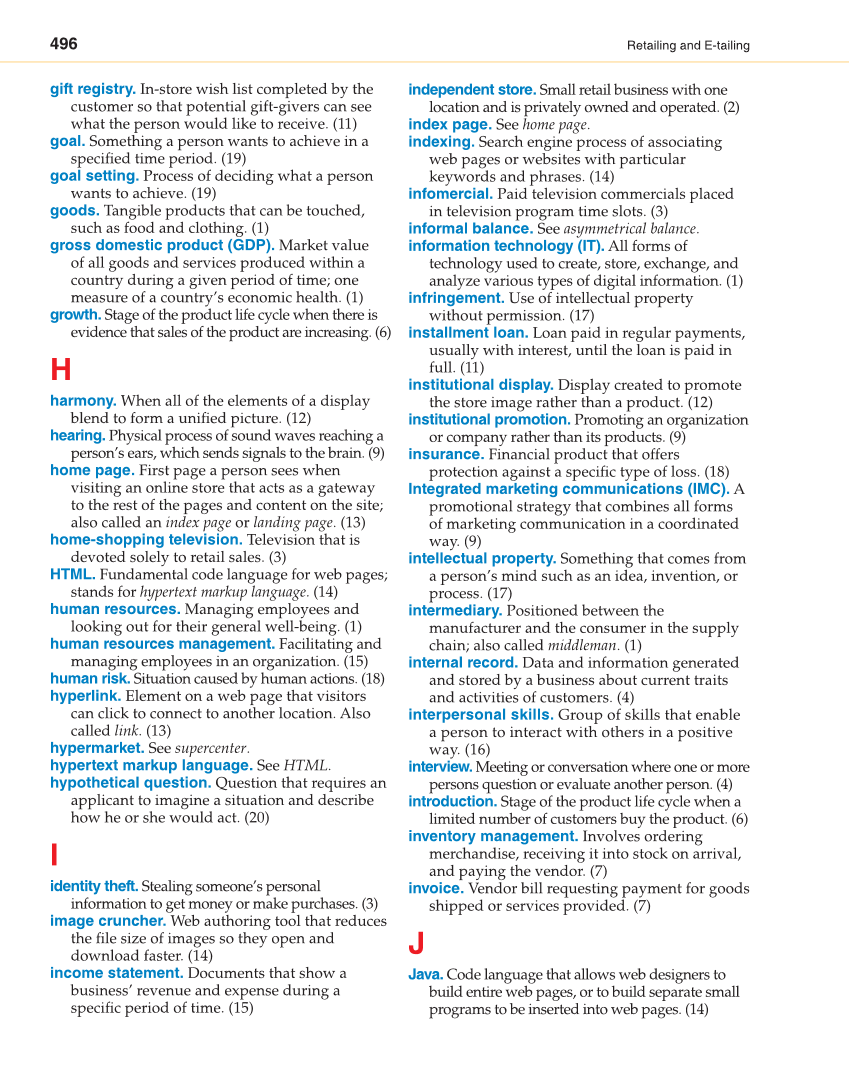 496 Retailing and E-tailing gift registry. In-store wish list completed by the customer so that potential gift-givers can see what the person would like to receive. (11) goal. Something a person wants to achieve in a specifi ed time period. (19) goal setting. Process of deciding what a person wants to achieve. (19) goods. Tangible products that can be touched, such as food and clothing. (1) gross domestic product (GDP). Market value of all goods and services produced within a country during a given period of time one measure of a country’s economic health. (1) growth. Stage of the product life cycle when there is evidence that sales of the product are increasing. (6) H harmony. When all of the elements of a display blend to form a unifi ed picture. (12) hearing. Physical process of sound waves reaching a person’s ears, which sends signals to the brain. (9) home page. First page a person sees when visiting an online store that acts as a gateway to the rest of the pages and content on the site also called an index page or landing page. (13) home-shopping television. Television that is devoted solely to retail sales. (3) HTML. Fundamental code language for web pages stands for hypertext markup language. (14) human resources. Managing employees and looking out for their general well-being. (1) human resources management. Facilitating and managing employees in an organization. (15) human risk. Situation caused by human actions. (18) hyperlink. Element on a web page that visitors can click to connect to another location. Also called link. (13) hypermarket. See supercenter. hypertext markup language. See HTML. hypothetical question. Question that requires an applicant to imagine a situation and describe how he or she would act. (20) I identity theft. Stealing someone’s personal information to get money or make purchases. (3) image cruncher. Web authoring tool that reduces the fi le size of images so they open and download faster. (14) income statement. Documents that show a business’ revenue and expense during a specifi c period of time. (15) independent store. Small retail business with one location and is privately owned and operated. (2) index page. See home page. indexing. Search engine process of associating web pages or websites with particular keywords and phrases. (14) infomercial. Paid television commercials placed in television program time slots. (3) informal balance. See asymmetrical balance. information technology (IT). All forms of technology used to create, store, exchange, and analyze various types of digital information. (1) infringement. Use of intellectual property without permission. (17) installment loan. Loan paid in regular payments, usually with interest, until the loan is paid in full. (11) institutional display. Display created to promote the store image rather than a product. (12) institutional promotion. Promoting an organization or company rather than its products. (9) insurance. Financial product that offers protection against a specifi c type of loss. (18) Integrated marketing communications (IMC). A promotional strategy that combines all forms of marketing communication in a coordinated way. (9) intellectual property. Something that comes from a person’s mind such as an idea, invention, or process. (17) intermediary. Positioned between the manufacturer and the consumer in the supply chain also called middleman. (1) internal record. Data and information generated and stored by a business about current traits and activities of customers. (4) interpersonal skills. Group of skills that enable a person to interact with others in a positive way. (16) interview. Meeting or conversation where one or more persons question or evaluate another person. (4) introduction. Stage of the product life cycle when a limited number of customers buy the product. (6) inventory management. Involves ordering merchandise, receiving it into stock on arrival, and paying the vendor. (7) invoice. Vendor bill requesting payment for goods shipped or services provided. (7) J Java. Code language that allows web designers to build entire web pages, or to build separate small programs to be inserted into web pages. (14)