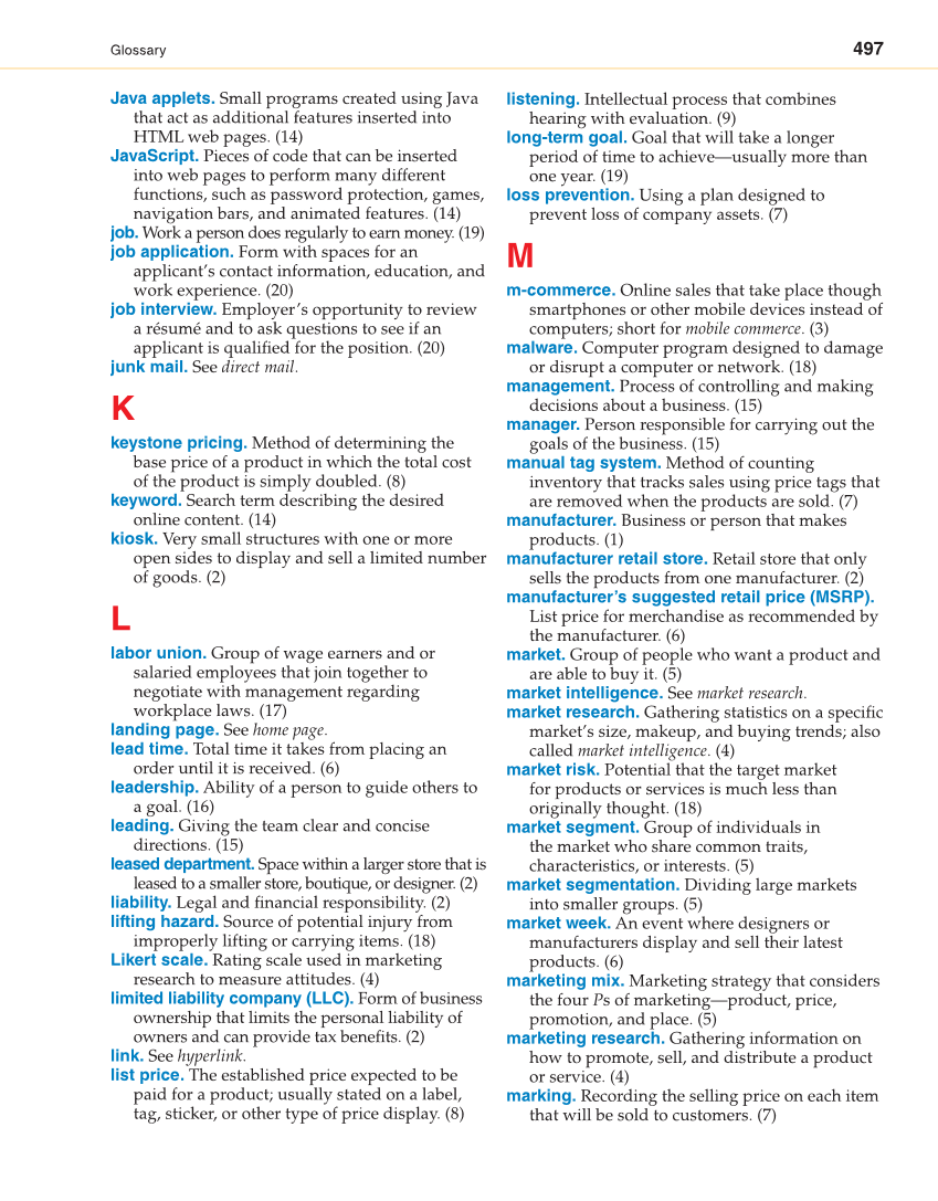 497 Glossary Java applets. Small programs created using Java that act as additional features inserted into HTML web pages. (14) JavaScript. Pieces of code that can be inserted into web pages to perform many different functions, such as password protection, games, navigation bars, and animated features. (14) job. Work a person does regularly to earn money. (19) job application. Form with spaces for an applicant’s contact information, education, and work experience. (20) job interview. Employer’s opportunity to review a résumé and to ask questions to see if an applicant is qualifi ed for the position. (20) junk mail. See direct mail. K keystone pricing. Method of determining the base price of a product in which the total cost of the product is simply doubled. (8) keyword. Search term describing the desired online content. (14) kiosk. Very small structures with one or more open sides to display and sell a limited number of goods. (2) L labor union. Group of wage earners and or salaried employees that join together to negotiate with management regarding workplace laws. (17) landing page. See home page. lead time. Total time it takes from placing an order until it is received. (6) leadership. Ability of a person to guide others to a goal. (16) leading. Giving the team clear and concise directions. (15) leased department. Space within a larger store that is leased to a smaller store, boutique, or designer. (2) liability. Legal and fi nancial responsibility. (2) lifting hazard. Source of potential injury from improperly lifting or carrying items. (18) Likert scale. Rating scale used in marketing research to measure attitudes. (4) limited liability company (LLC). Form of business ownership that limits the personal liability of owners and can provide tax benefi ts. (2) link. See hyperlink. list price. The established price expected to be paid for a product usually stated on a label, tag, sticker, or other type of price display. (8) listening. Intellectual process that combines hearing with evaluation. (9) long-term goal. Goal that will take a longer period of time to achieve—usually more than one year. (19) loss prevention. Using a plan designed to prevent loss of company assets. (7) M m-commerce. Online sales that take place though smartphones or other mobile devices instead of computers short for mobile commerce. (3) malware. Computer program designed to damage or disrupt a computer or network. (18) management. Process of controlling and making decisions about a business. (15) manager. Person responsible for carrying out the goals of the business. (15) manual tag system. Method of counting inventory that tracks sales using price tags that are removed when the products are sold. (7) manufacturer. Business or person that makes products. (1) manufacturer retail store. Retail store that only sells the products from one manufacturer. (2) manufacturer’s suggested retail price (MSRP). List price for merchandise as recommended by the manufacturer. (6) market. Group of people who want a product and are able to buy it. (5) market intelligence. See market research. market research. Gathering statistics on a specifi c market’s size, makeup, and buying trends also called market intelligence. (4) market risk. Potential that the target market for products or services is much less than originally thought. (18) market segment. Group of individuals in the market who share common traits, characteristics, or interests. (5) market segmentation. Dividing large markets into smaller groups. (5) market week. An event where designers or manufacturers display and sell their latest products. (6) marketing mix. Marketing strategy that considers the four Ps of marketing—product, price, promotion, and place. (5) marketing research. Gathering information on how to promote, sell, and distribute a product or service. (4) marking. Recording the selling price on each item that will be sold to customers. (7)