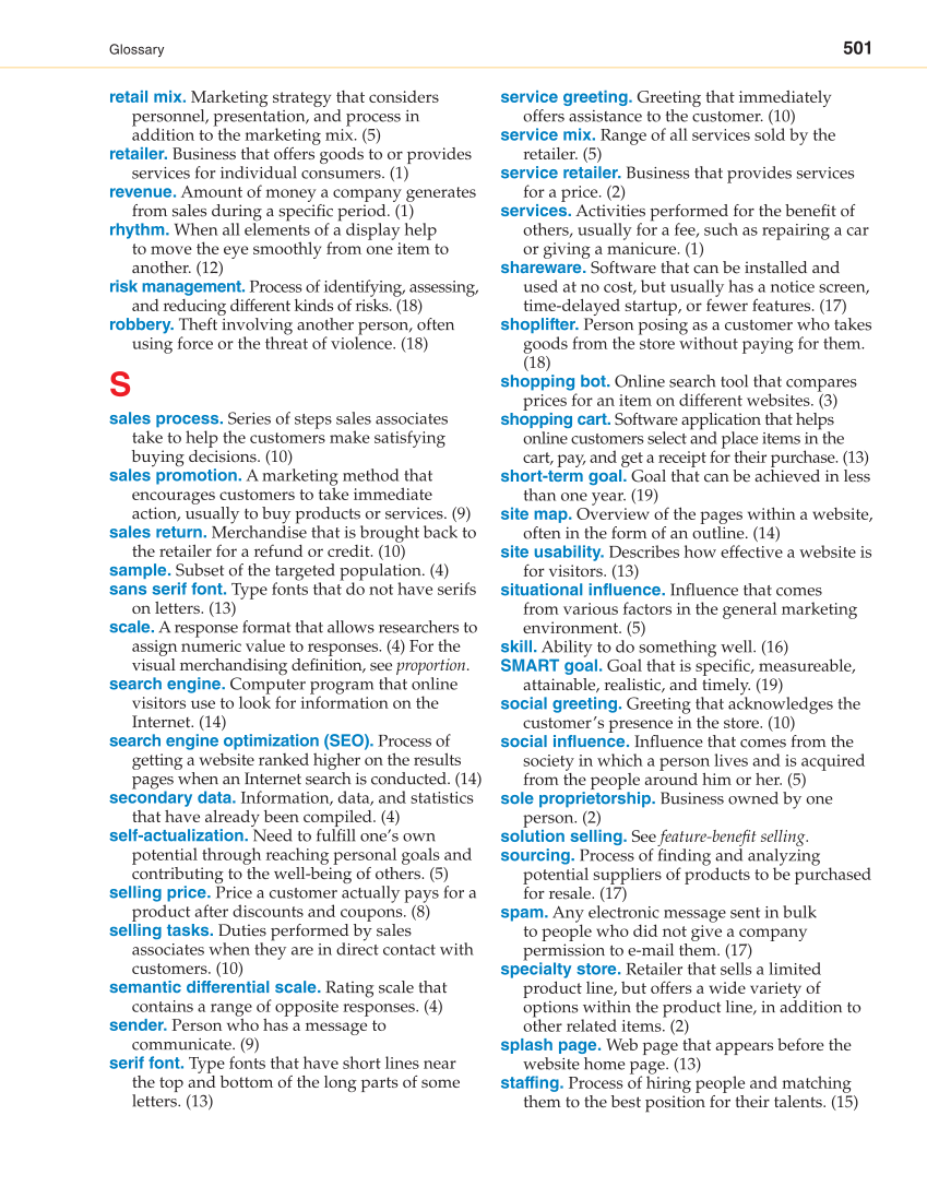 501 Glossary retail mix. Marketing strategy that considers personnel, presentation, and process in addition to the marketing mix. (5) retailer. Business that offers goods to or provides services for individual consumers. (1) revenue. Amount of money a company generates from sales during a specifi c period. (1) rhythm. When all elements of a display help to move the eye smoothly from one item to another. (12) risk management. Process of identifying, assessing, and reducing different kinds of risks. (18) robbery. Theft involving another person, often using force or the threat of violence. (18) S sales process. Series of steps sales associates take to help the customers make satisfying buying decisions. (10) sales promotion. A marketing method that encourages customers to take immediate action, usually to buy products or services. (9) sales return. Merchandise that is brought back to the retailer for a refund or credit. (10) sample. Subset of the targeted population. (4) sans serif font. Type fonts that do not have serifs on letters. (13) scale. A response format that allows researchers to assign numeric value to responses. (4) For the visual merchandising defi nition, see proportion. search engine. Computer program that online visitors use to look for information on the Internet. (14) search engine optimization (SEO). Process of getting a website ranked higher on the results pages when an Internet search is conducted. (14) secondary data. Information, data, and statistics that have already been compiled. (4) self-actualization. Need to fulfi ll one’s own potential through reaching personal goals and contributing to the well-being of others. (5) selling price. Price a customer actually pays for a product after discounts and coupons. (8) selling tasks. Duties performed by sales associates when they are in direct contact with customers. (10) semantic differential scale. Rating scale that contains a range of opposite responses. (4) sender. Person who has a message to communicate. (9) serif font. Type fonts that have short lines near the top and bottom of the long parts of some letters. (13) service greeting. Greeting that immediately offers assistance to the customer. (10) service mix. Range of all services sold by the retailer. (5) service retailer. Business that provides services for a price. (2) services. Activities performed for the benefi t of others, usually for a fee, such as repairing a car or giving a manicure. (1) shareware. Software that can be installed and used at no cost, but usually has a notice screen, time-delayed startup, or fewer features. (17) shoplifter. Person posing as a customer who takes goods from the store without paying for them. (18) shopping bot. Online search tool that compares prices for an item on different websites. (3) shopping cart. Software application that helps online customers select and place items in the cart, pay, and get a receipt for their purchase. (13) short-term goal. Goal that can be achieved in less than one year. (19) site map. Overview of the pages within a website, often in the form of an outline. (14) site usability. Describes how effective a website is for visitors. (13) situational influence. Infl uence that comes from various factors in the general marketing environment. (5) skill. Ability to do something well. (16) SMART goal. Goal that is specifi c, measureable, attainable, realistic, and timely. (19) social greeting. Greeting that acknowledges the customer’s presence in the store. (10) social influence. Infl uence that comes from the society in which a person lives and is acquired from the people around him or her. (5) sole proprietorship. Business owned by one person. (2) solution selling. See feature-benefi t selling. sourcing. Process of fi nding and analyzing potential suppliers of products to be purchased for resale. (17) spam. Any electronic message sent in bulk to people who did not give a company permission to e-mail them. (17) specialty store. Retailer that sells a limited product line, but offers a wide variety of options within the product line, in addition to other related items. (2) splash page. Web page that appears before the website home page. (13) staffing. Process of hiring people and matching them to the best position for their talents. (15)
