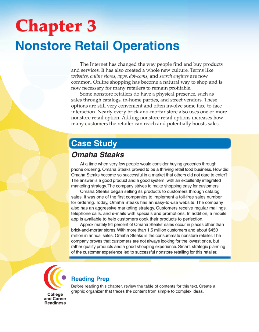Chapter 3 Nonstore Retail Operations The Internet has changed the way people fi nd and buy products and services. It has also created a whole new culture. Terms like websites, online stores, apps, dot-coms, and search engines are now common. Online shopping has become a natural way to shop and is now necessary for many retailers to remain profi table. Some nonstore retailers do have a physical presence, such as sales through catalogs, in-home parties, and street vendors. These options are still very convenient and often involve some face-to-face interaction. Nearly every brick-and-mortar store also uses one or more nonstore retail option. Adding nonstore retail options increases how many customers the retailer can reach and potentially boosts sales. Reading Prep Before reading this chapter, review the table of contents for this text. Create a graphic organizer that traces the content from simple to complex ideas. Case Study Omaha Steaks At a time when very few people would consider buying groceries through phone ordering, Omaha Steaks proved to be a thriving retail food business. How did Omaha Steaks become so successful in a market that others did not dare to enter? The answer is a good product and a good system, with an excellently integrated marketing strategy. The company strives to make shopping easy for customers. Omaha Steaks began selling its products to customers through catalog sales. It was one of the fi rst companies to implement a toll-free sales number for ordering. Today, Omaha Steaks has an easy-to-use website. The company also has an aggressive marketing strategy. Customers receive regular mailings, telephone calls, and e-mails with specials and promotions. In addition, a mobile app is available to help customers cook their products to perfection. Approximately 94 percent of Omaha Steaks’ sales occur in places other than brick-and-mortar stores. With more than 1.5 million customers and about $450 million in annual sales, Omaha Steaks is the consummate nonstore retailer. The company proves that customers are not always looking for the lowest price, but rather quality products and a good shopping experience. Smart, strategic planning of the customer experience led to successful nonstore retailing for this retailer. College and Career Readiness