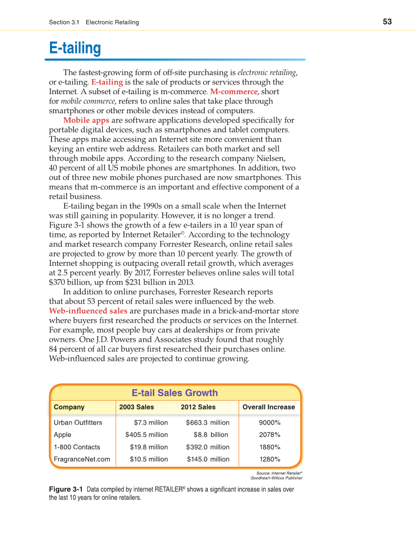 53 Section 3.1 Electronic Retailing E-tailing The fastest-growing form of off-site purchasing is electronic retailing, or e-tailing. E-tailing is the sale of products or services through the Internet. A subset of e-tailing is m-commerce. M-commerce, short for mobile commerce, refers to online sales that take place through smartphones or other mobile devices instead of computers. Mobile apps are software applications developed specifi cally for portable digital devices, such as smartphones and tablet computers. These apps make accessing an Internet site more convenient than keying an entire web address. Retailers can both market and sell through mobile apps. According to the research company Nielsen, 40 percent of all US mobile phones are smartphones. In addition, two out of three new mobile phones purchased are now smartphones. This means that m-commerce is an important and effective component of a retail business. E-tailing began in the 1990s on a small scale when the Internet was still gaining in popularity. However, it is no longer a trend. Figure 3-1 shows the growth of a few e-tailers in a 10 year span of time, as reported by Internet Retailer©. According to the technology and market research company Forrester Research, online retail sales are projected to grow by more than 10 percent yearly. The growth of Internet shopping is outpacing overall retail growth, which averages at 2.5 percent yearly. By 2017, Forrester believes online sales will total $370 billion, up from $231 billion in 2013. In addition to online purchases, Forrester Research reports that about 53 percent of retail sales were infl uenced by the web. Web-infl uenced sales are purchases made in a brick-and-mortar store where buyers fi rst researched the products or services on the Internet. For example, most people buy cars at dealerships or from private owners. One J.D. Powers and Associates study found that roughly 84 percent of all car buyers fi rst researched their purchases online. Web-infl uenced sales are projected to continue growing. E-tail Sales GrowthhrowtG Company 2003 Sales 2012 Sales Overall Urban Outfitters $7.3 million $663.3 million 9000%% Apple $405.5 million $8.8 billion 2078%% 1-800 Contacts $19.8 million $392.0 million 1880%%8801 FragranceNet.com $10.5 million $145.0 million 1280%1 Source: Internet Retailer© Goodheart-Willcox Publisher Figure 3-1 Data compiled by internet RETAILER© shows a signifi cant increase in sales over the last 10 years for online retailers. E -tail S ales Company 2003 3 S ales 2012 S ales Overall InIncreaseseeacr Urban O utfitter s $ 7.3 million $ 663.3 million 9000 A pp le $ 405.5 million $ 8.8 billion 2078 1 -800 C ontacts $ 19.8 million $ 392.0 million FragranceNet.com $ 10.5 million $ 145.0 million 280%