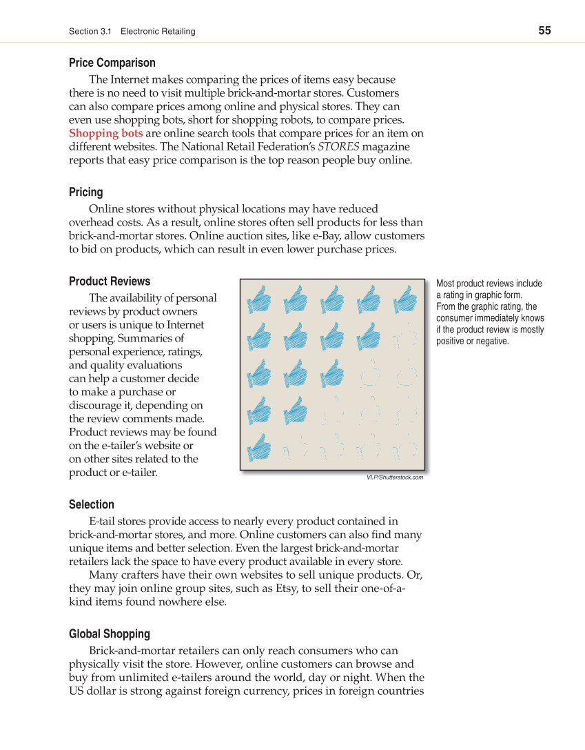 55 Section 3.1 Electronic Retailing Price Comparison The Internet makes comparing the prices of items easy because there is no need to visit multiple brick-and-mortar stores. Customers can also compare prices among online and physical stores. They can even use shopping bots, short for shopping robots, to compare prices. Shopping bots are online search tools that compare prices for an item on different websites. The National Retail Federation’s STORES magazine reports that easy price comparison is the top reason people buy online. Pricing Online stores without physical locations may have reduced overhead costs. As a result, online stores often sell products for less than brick-and-mortar stores. Online auction sites, like e-Bay, allow customers to bid on products, which can result in even lower purchase prices. Product Reviews The availability of personal reviews by product owners or users is unique to Internet shopping. Summaries of personal experience, ratings, and quality evaluations can help a customer decide to make a purchase or discourage it, depending on the review comments made. Product reviews may be found on the e-tailer’s website or on other sites related to the product or e-tailer. Selection E-tail stores provide access to nearly every product contained in brick-and-mortar stores, and more. Online customers can also fi nd many unique items and better selection. Even the largest brick-and-mortar retailers lack the space to have every product available in every store. Many crafters have their own websites to sell unique products. Or, they may join online group sites, such as Etsy, to sell their one-of-a- kind items found nowhere else. Global Shopping Brick-and-mortar retailers can only reach consumers who can physically visit the store. However, online customers can browse and buy from unlimited e-tailers around the world, day or night. When the US dollar is strong against foreign currency, prices in foreign countries Most product reviews include a rating in graphic form. From the graphic rating, the consumer immediately knows if the product review is mostly positive or negative. VI.P/Shutterstock.com
