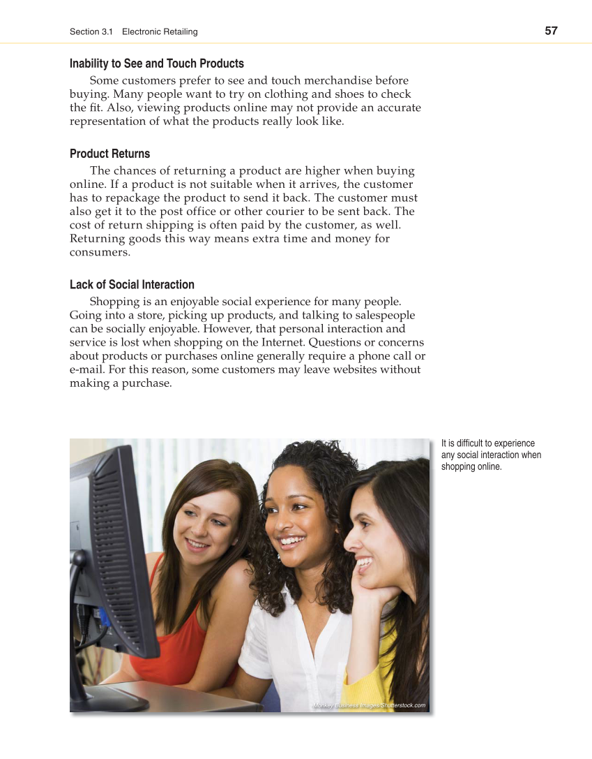 57 Section 3.1 Electronic Retailing Inability to See and Touch Products Some customers prefer to see and touch merchandise before buying. Many people want to try on clothing and shoes to check the fi t. Also, viewing products online may not provide an accurate representation of what the products really look like. Product Returns The chances of returning a product are higher when buying online. If a product is not suitable when it arrives, the customer has to repackage the product to send it back. The customer must also get it to the post office or other courier to be sent back. The cost of return shipping is often paid by the customer, as well. Returning goods this way means extra time and money for consumers. Lack of Social Interaction Shopping is an enjoyable social experience for many people. Going into a store, picking up products, and talking to salespeople can be socially enjoyable. However, that personal interaction and service is lost when shopping on the Internet. Questions or concerns about products or purchases online generally require a phone call or e-mail. For this reason, some customers may leave websites without making a purchase. It is diffi cult to experience any social interaction when shopping online. Monkey Business Images/Shutterstock.com