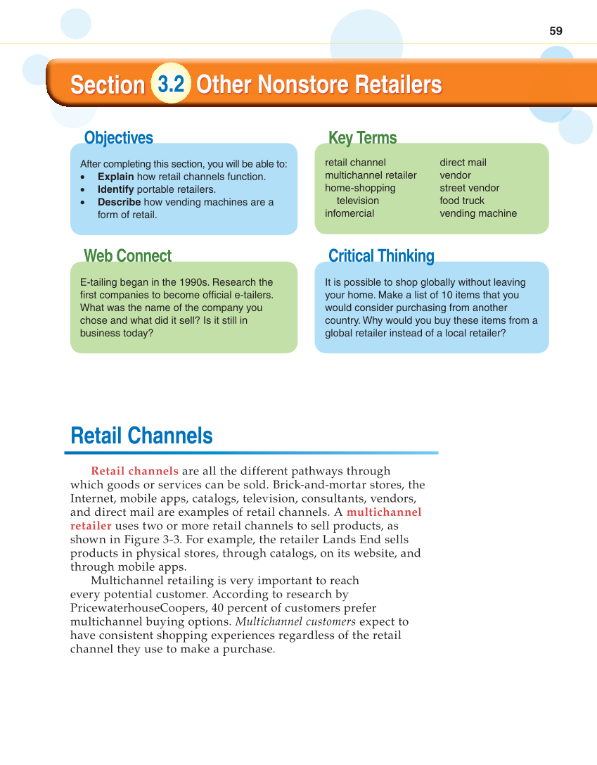 59 Key Terms Objectives Critical Thinking Web Connect Other Nonstore Retailers 3.2 After completing this section, you will be able to: • Explain how retail channels function. • Identify portable retailers. • Describe how vending machines are a form of retail. retail channel multichannel retailer home-shopping television infomercial direct mail vendor street vendor food truck vending machine E-tailing began in the 1990s. Research the fi rst companies to become offi cial e-tailers. What was the name of the company you chose and what did it sell? Is it still in business today? It is possible to shop globally without leaving your home. Make a list of 10 items that you would consider purchasing from another country. Why would you buy these items from a global retailer instead of a local retailer? Retail Channels Retail channels are all the different pathways through which goods or services can be sold. Brick-and-mortar stores, the Internet, mobile apps, catalogs, television, consultants, vendors, and direct mail are examples of retail channels. A multichannel retailer uses two or more retail channels to sell products, as shown in Figure 3-3. For example, the retailer Lands End sells products in physical stores, through catalogs, on its website, and through mobile apps. Multichannel retailing is very important to reach every potential customer. According to research by PricewaterhouseCoopers, 40 percent of customers prefer multichannel buying options. Multichannel customers expect to have consistent shopping experiences regardless of the retail channel they use to make a purchase. Section