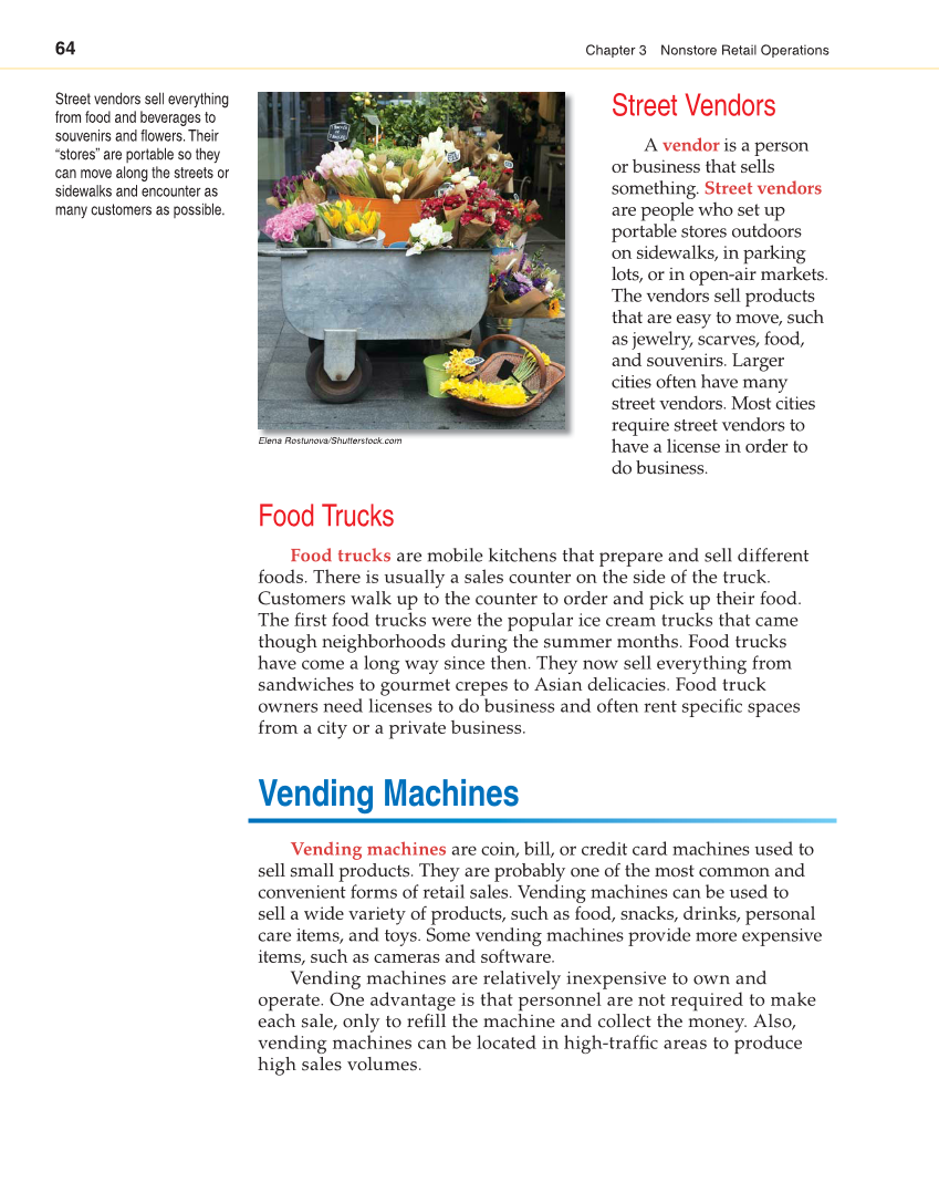 64 Chapter 3 Nonstore Retail Operations Street Vendors A vendor is a person or business that sells something. Street vendors are people who set up portable stores outdoors on sidewalks, in parking lots, or in open-air markets. The vendors sell products that are easy to move, such as jewelry, scarves, food, and souvenirs. Larger cities often have many street vendors. Most cities require street vendors to have a license in order to do business. Food Trucks Food trucks are mobile kitchens that prepare and sell different foods. There is usually a sales counter on the side of the truck. Customers walk up to the counter to order and pick up their food. The fi rst food trucks were the popular ice cream trucks that came though neighborhoods during the summer months. Food trucks have come a long way since then. They now sell everything from sandwiches to gourmet crepes to Asian delicacies. Food truck owners need licenses to do business and often rent specifi c spaces from a city or a private business. Vending Machines Vending machines are coin, bill, or credit card machines used to sell small products. They are probably one of the most common and convenient forms of retail sales. Vending machines can be used to sell a wide variety of products, such as food, snacks, drinks, personal care items, and toys. Some vending machines provide more expensive items, such as cameras and software. Vending machines are relatively inexpensive to own and operate. One advantage is that personnel are not required to make each sale, only to refi ll the machine and collect the money. Also, vending machines can be located in high-traffi c areas to produce high sales volumes. Street vendors sell everything from food and beverages to souvenirs and fl owers. Their “stores” are portable so they can move along the streets or sidewalks and encounter as many customers as possible. Elena Rostunova/Shutterstock.com