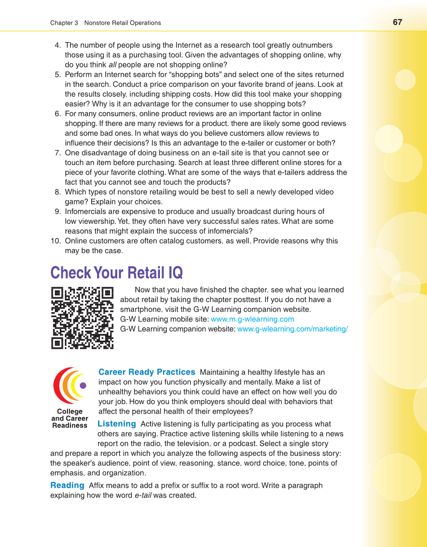 Chapter 3 Nonstore Retail Operations 67 4. The number of people using the Internet as a research tool greatly outnumbers those using it as a purchasing tool. Given the advantages of shopping online, why do you think all people are not shopping online? 5. Perform an Internet search for “shopping bots” and select one of the sites returned in the search. Conduct a price comparison on your favorite brand of jeans. Look at the results closely, including shipping costs. How did this tool make your shopping easier? Why is it an advantage for the consumer to use shopping bots? 6. For many consumers, online product reviews are an important factor in online shopping. If there are many reviews for a product, there are likely some good reviews and some bad ones. In what ways do you believe customers allow reviews to infl uence their decisions? Is this an advantage to the e-tailer or customer or both? 7. One disadvantage of doing business on an e-tail site is that you cannot see or touch an item before purchasing. Search at least three different online stores for a piece of your favorite clothing. What are some of the ways that e-tailers address the fact that you cannot see and touch the products? 8. Which types of nonstore retailing would be best to sell a newly developed video game? Explain your choices. 9. Infomercials are expensive to produce and usually broadcast during hours of low viewership. Yet, they often have very successful sales rates. What are some reasons that might explain the success of infomercials? 10. Online customers are often catalog customers, as well. Provide reasons why this may be the case. Check Your Retail IQ Now that you have fi nished the chapter, see what you learned about retail by taking the chapter posttest. If you do not have a smartphone, visit the G-W Learning companion website. G-W Learning mobile site: www.m.g-wlearning.com G-W Learning companion website: www.g-wlearning.com/marketing/ Career Ready Practices Maintaining a healthy lifestyle has an impact on how you function physically and mentally. Make a list of unhealthy behaviors you think could have an effect on how well you do your job. How do you think employers should deal with behaviors that affect the personal health of their employees? Listening Active listening is fully participating as you process what others are saying. Practice active listening skills while listening to a news report on the radio, the television, or a podcast. Select a single story and prepare a report in which you analyze the following aspects of the business story: the speaker’s audience, point of view, reasoning, stance, word choice, tone, points of emphasis, and organization. Reading Affi x means to add a prefi x or suffi x to a root word. Write a paragraph explaining how the word e-tail was created. College and Career Readiness