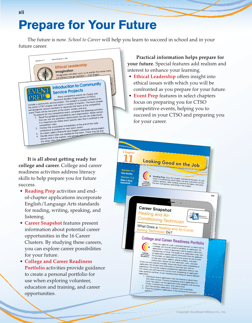 xii Copyright Goodheart-Willcox Co., Inc. Prepare for Your Future The future is now. School to Career will help you learn to succeed in school and in your future career. It is all about getting ready for college and career. College and career readiness activities address literacy skills to help prepare you for future success. • Reading Prep activities and end- of-chapter applications incorporate English/Language Arts standards for reading, writing, speaking, and listening. • Career Snapshot features present information about potential career opportunities in the 16 Career Clusters. By studying these careers, you can explore career possibilities for your future. • College and Career Readiness Portfolio activities provide guidance to create a personal portfolio for use when exploring volunteer, education and training, and career opportunities. Section 4.1 Searching for a Job the more likely the jobs will become fi lled by other applicants. Unfortunately, most job openings are not advertised. The want ads represent only a fraction of the total number of jobs available. Consequently, you should not rely solely on want ads to fi nd a job. may find blind ads. A blind ad is a job any or contact Ethical Leadership Imagination “Imagination will often carry us to worlds that never were, but without it we go nowhere.”— Carl Sagan Imaginative leaders are creative. They use their imagination in positive ways to inspire and solve problems. However, your imagination can also be used unethically. when a résumé you will want to make yourself look as good as possible. However, do not let your imagination take you away from the truth. would be unethical to state that you coordinated your employer’s advertising campaigns if you only proofread advertising fl the more likely the jobs will become fi lle d by oth er applicants.chapter fi Unfortunately, most job openings are not advertised. The want ads represent only a fra ction of the to Consequently, y “Imagination wi but without it we go nowhere.”— Carl Sag an Imag inative leaders are creative . They use their imagination in positive ways to inspire and solve problems. Hwriting owever, your imagination can also be use d unethically. For example, when writing a résumé you will want to make yourself look as good as poss ible. However, do not let your imagination take you away from the truth. It would be unethical to state that you coordinated your pre vious employer’s advertising campaigns if you only proofread advertising flyers.s.previous yer fl not advertised. The want a fra ction of the to Consequently, yo development, impact, and p For more information about the Technology Stud visit www.tsaweb.org. Introduction to Community Service Projects Many competitive events for Career and Technical Student Organizations (CTSOs) include a community service project. This project is usually carried out by the entire CTSO chapter and spans a number of months. The local will designate several members to represent the team at the competitive event.There will be two parts of the event: written and oral. To prepare for any competitive event, complete the following activities: 1. Read the guidelines provided by your organization. Make certain that you ask any questions about points you do not understand. It is important you follow each specifi c item that is outlined in the competition rules. 2. Contact the association immediately at the end of the state conference to prepare for next year’s event. 3. As a team, select a theme for your chapter’s community 4. Decide which roles are needed for the team. There may one person who is the captain, one person who is the secretary, any other roles that will be necessary to create the your instructor for guidance in assigning roles to team members.Askandbeproject.plan.service if our target audience, which may include business, EVENTForItexample, PREP NT EVEN PREP PREP Introduction When you meet someone for the fi rst time, what do you notice right away? Most people notice a person’s appearance. In fact, people tend to form fi rst impressions about others based on appearance. Many employers assume that people who take pride in th i appearance are likely to tak id Looking Good on the Job 11 Section 11.1 Stay Healthy Section 11.2 Make a Good Impression Reading Prep. Scan this chapter and look for the facts. As you read, try to determine which topics are facts and which are the author’s opinions. After reading, research the topics and verify the facts and opinions presented in the chapter. College and Career Readiness Chapter nd verifyy presented in the chapter. Readi ness 109 Career Snapshot Heating and Air- Conditioning Technician What Does a Heating and Air-Condi- tioning Technician Heating and air-conditioning technicians install and service heating, ventilation, air-conditioning, and refrigeration (HVACR) systems. They • work on mechanical, electrical, and electronic HVACR components andmust: • possess a broad technical understanding to be able to diagnose and correct problems related to these systems. What Is It Like to Work as a Heating and Air-Conditioning Technician? Often called HVACR gActivity echni14–1an ci DDo? o? File Understanding Parliamentary Procedure College and Career Readiness Portfolio When you apply for a job, a volunteer position, or admission to a college, you may be asked to complete an application. An application is a form or document used to request admission, membership, or hiring. The length of an application varies, but all applications require specifi c information from the applicant. For example, an application will have spaces for you to write or type your name, address, phone numbers, and other contact data. Spaces for your education, skills, and work history are also typically included. Always be honest when completing an application. Do not give false information or overstate your skills or experience. You may be asked to complete the application while on site
