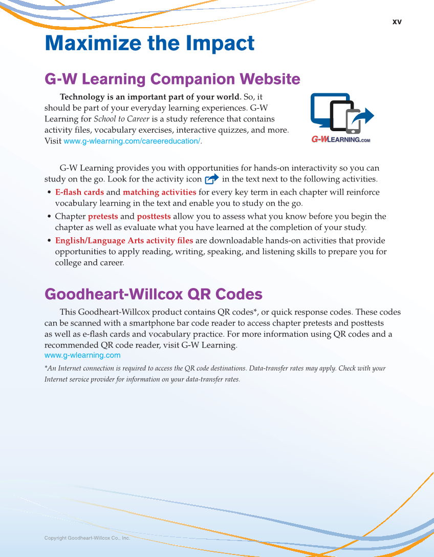 xv Copyright Goodheart-Willcox Co., Inc. Maximize the Impact G-W Learning provides you with opportunities for hands-on interactivity so you can study on the go. Look for the activity icon in the text next to the following activities. • E-fl ash cards and matching activities for every key term in each chapter will reinforce vocabulary learning in the text and enable you to study on the go. • Chapter pretests and posttests allow you to assess what you know before you begin the chapter as well as evaluate what you have learned at the completion of your study. • English/Language Arts activity fi les are downloadable hands-on activities that provide opportunities to apply reading, writing, speaking, and listening skills to prepare you for college and career. Goodheart-Willcox QR Codes This Goodheart-Willcox product contains QR codes*, or quick response codes. These codes can be scanned with a smartphone bar code reader to access chapter pretests and posttests as well as e-fl ash cards and vocabulary practice. For more information using QR codes and a recommended QR code reader, visit G-W Learning. www.g-wlearning.com *An Internet connection is required to access the QR code destinations. Data-transfer rates may apply. Check with your Internet service provider for information on your data-transfer rates. G-W Learning Companion Website Technology is an important part of your world. So, it should be part of your everyday learning experiences. G-W Learning for School to Career is a study reference that contains activity fi les, vocabulary exercises, interactive quizzes, and more. Visit www.g-wlearning.com/careereducation/.