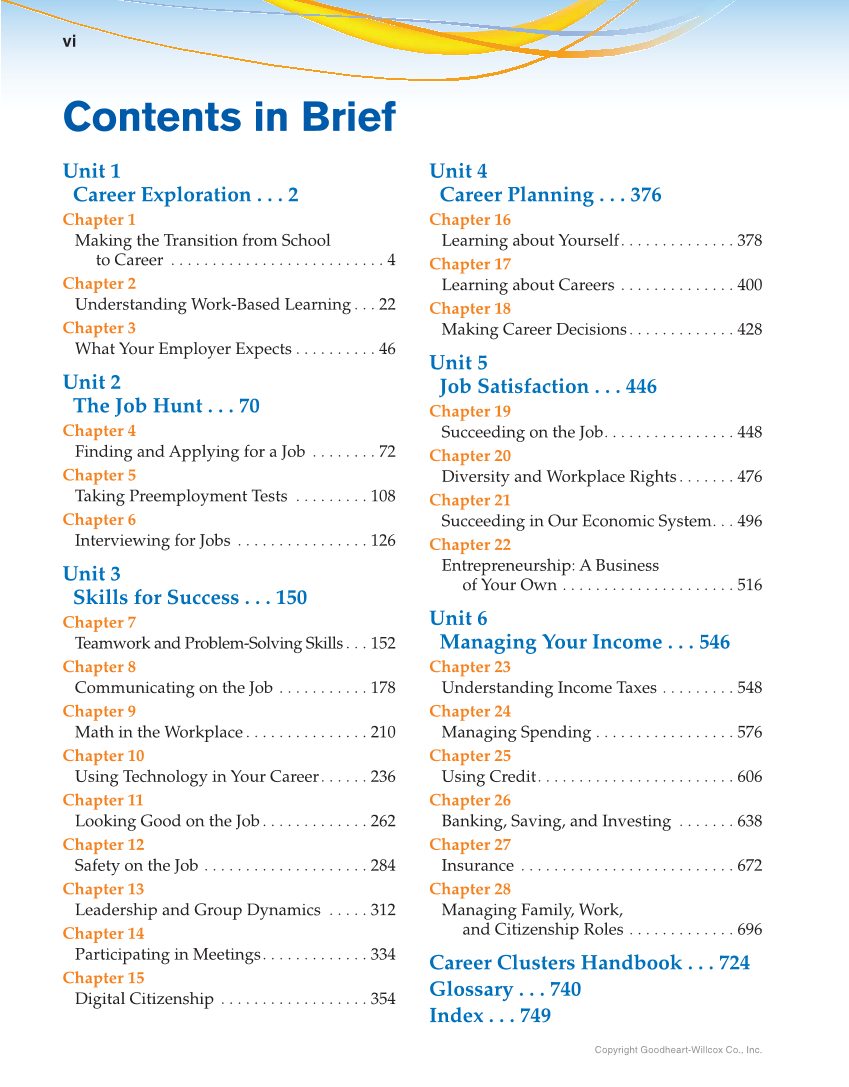 vi Copyright Goodheart-Willcox Co., Inc. Contents in Brief Unit 1 Career Exploration . . . 2 Chapter 1 Making the Transition from School to Career . . . . . . . . . . . . . . . . . . . . . . . . . . 4 Chapter 2 Understanding Work-Based Learning . . . 22 Chapter 3 What Your Employer Expects . . . . . . . . . . 46 Unit 2 The Job Hunt . . . 70 Chapter 4 Finding and Applying for a Job . . . . . . . . 72 Chapter 5 Taking Preemployment Tests . . . . . . . . . 108 Chapter 6 Interviewing for Jobs . . . . . . . . . . . . . . . . 126 Unit 3 Skills for Success . . . 150 Chapter 7 Teamwork and Problem-Solving Skills . . . 152 Chapter 8 Communicating on the Job . . . . . . . . . . . 178 Chapter 9 Math in the Workplace . . . . . . . . . . . . . . . 210 Chapter 10 Using Technology in Your Career . . . . . . 236 Chapter 11 Looking Good on the Job . . . . . . . . . . . . . 262 Chapter 12 Safety on the Job . . . . . . . . . . . . . . . . . . . . 284 Chapter 13 Leadership and Group Dynamics . . . . . 312 Chapter 14 Participating in Meetings . . . . . . . . . . . . . 334 Chapter 15 Digital Citizenship . . . . . . . . . . . . . . . . . . 354 Unit 4 Career Planning . . . 376 Chapter 16 Learning about Yourself . . . . . . . . . . . . . . 378 Chapter 17 Learning about Careers . . . . . . . . . . . . . . 400 Chapter 18 Making Career Decisions . . . . . . . . . . . . . 428 Unit 5 Job Satisfaction . . . 446 Chapter 19 Succeeding on the Job . . . . . . . . . . . . . . . . 448 Chapter 20 Diversity and Workplace Rights . . . . . . . 476 Chapter 21 Succeeding in Our Economic System . . . 496 Chapter 22 Entrepreneurship: A Business of Your Own . . . . . . . . . . . . . . . . . . . . . 516 Unit 6 Managing Your Income . . . 546 Chapter 23 Understanding Income Taxes . . . . . . . . . 548 Chapter 24 Managing Spending . . . . . . . . . . . . . . . . . 576 Chapter 25 Using Credit . . . . . . . . . . . . . . . . . . . . . . . . 606 Chapter 26 Banking, Saving, and Investing . . . . . . . 638 Chapter 27 Insurance . . . . . . . . . . . . . . . . . . . . . . . . . . 672 Chapter 28 Managing Family, Work, and Citizenship Roles . . . . . . . . . . . . . 696 Career Clusters Handbook . . . 724 Glossary . . . 740 Index . . . 749