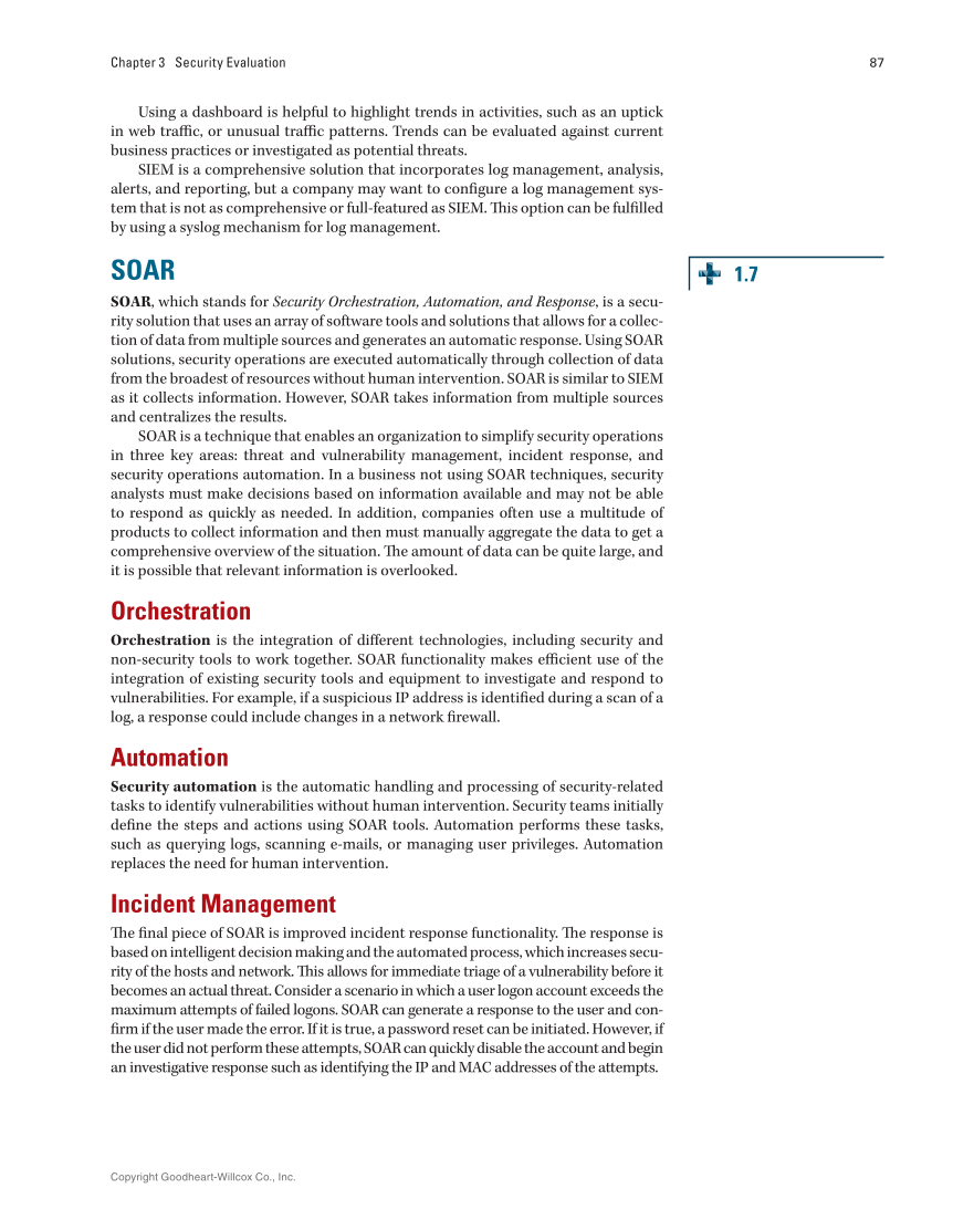 Copyright Goodheart-Willcox Co., Inc. 87 Chapter 3 Security Evaluation Using a dashboard is helpful to highlight trends in activities, such as an uptick in web traffic, or unusual traffic patterns. Trends can be evaluated against current business practices or investigated as potential threats. SIEM is a comprehensive solution that incorporates log management, analysis, alerts, and reporting, but a company may want to configure a log management sys- tem that is not as comprehensive or full-featured as SIEM. This option can be fulfilled by using a syslog mechanism for log management. SOAR SOAR, which stands for Security Orchestration, Automation, and Response, is a secu- rity solution that uses an array of software tools and solutions that allows for a collec- tion of data from multiple sources and generates an automatic response. Using SOAR solutions, security operations are executed automatically through collection of data from the broadest of resources without human intervention. SOAR is similar to SIEM as it collects information. However, SOAR takes information from multiple sources and centralizes the results. SOAR is a technique that enables an organization to simplify security operations in three key areas: threat and vulnerability management, incident response, and security operations automation. In a business not using SOAR techniques, security analysts must make decisions based on information available and may not be able to respond as quickly as needed. In addition, companies often use a multitude of products to collect information and then must manually aggregate the data to get a comprehensive overview of the situation. The amount of data can be quite large, and it is possible that relevant information is overlooked. Orchestration Orchestration is the integration of different technologies, including security and non-security tools to work together. SOAR functionality makes efficient use of the integration of existing security tools and equipment to investigate and respond to vulnerabilities. For example, if a suspicious IP address is identified during a scan of a log, a response could include changes in a network firewall. Automation Security automation is the automatic handling and processing of security-related tasks to identify vulnerabilities without human intervention. Security teams initially define the steps and actions using SOAR tools. Automation performs these tasks, such as querying logs, scanning e-mails, or managing user privileges. Automation replaces the need for human intervention. Incident Management The final piece of SOAR is improved incident response functionality. The response is based on intelligent decision making and the automated process, which increases secu- rity of the hosts and network. This allows for immediate triage of a vulnerability before it becomes an actual threat. Consider a scenario in which a user logon account exceeds the maximum attempts of failed logons. SOAR can generate a response to the user and con- firm if the user made the error. If it is true, a password reset can be initiated. However, if the user did not perform these attempts, SOAR can quickly disable the account and begin an investigative response such as identifying the IP and MAC addresses of the attempts. 1.7