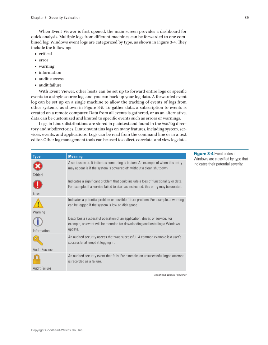 Copyright Goodheart-Willcox Co., Inc. 89 Chapter 3 Security Evaluation When Event Viewer is first opened, the main screen provides a dashboard for quick analysis. Multiple logs from different machines can be forwarded to one com- bined log. Windows event logs are categorized by type, as shown in Figure 3-4. They include the following: ■ ■■ critical ■■ error ■■ warning ■■ information ■■ audit success ■ audit failure With Event Viewer, other hosts can be set up to forward entire logs or specific events to a single source log, and you can back up your log data. A forwarded event log can be set up on a single machine to allow the tracking of events of logs from other systems, as shown in Figure 3-5. To gather data, a subscription to events is created on a remote computer. Data from all events is gathered, or as an alternative, data can be customized and limited to specific events such as errors or warnings. Logs in Linux distributions are stored in plaintext and found in the /var/log direc- tory and subdirectories. Linux maintains logs on many features, including system, ser- vices, events, and applications. Logs can be read from the command line or in a text editor. Other log management tools can be used to collect, correlate, and view log data. Type Meaning Critical A serious error. It indicates something is broken. An example of when this entry may appear is if the system is powered off without a clean shutdown. Error Indicates a significant problem that could include a loss of functionality or data. For example, if a service failed to start as instructed, this entry may be created. Warning Indicates a potential problem or possible future problem. For example, a warning can be logged if the system is low on disk space. Information Describes a successful operation of an application, driver, or service. For example, an event will be recorded for downloading and installing a Windows update. Audit Success An audited security access that was successful. A common example is a user’s successful attempt at logging in. Audit Failure An audited security event that fails. For example, an unsuccessful logon attempt is recorded as a failure. Goodheart-Willcox Publisher Figure 3-4 Event codes in Windows are classified by type that indicates their potential severity.