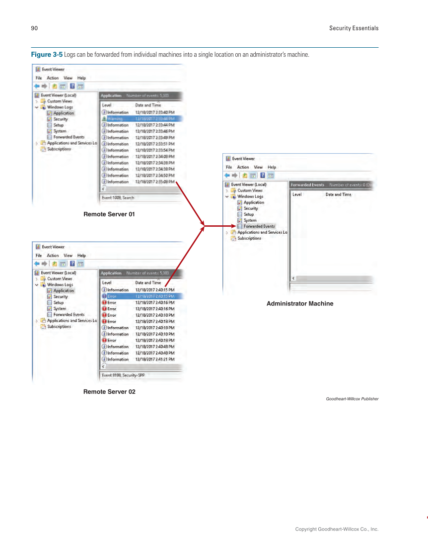 Copyright Goodheart-Willcox Co., Inc. 90 Security Essentials Remote Server 01 Remote Server 02 Administrator Machine Goodheart-Willcox Publisher Figure 3-5 Logs can be forwarded from individual machines into a single location on an administrator’s machine.