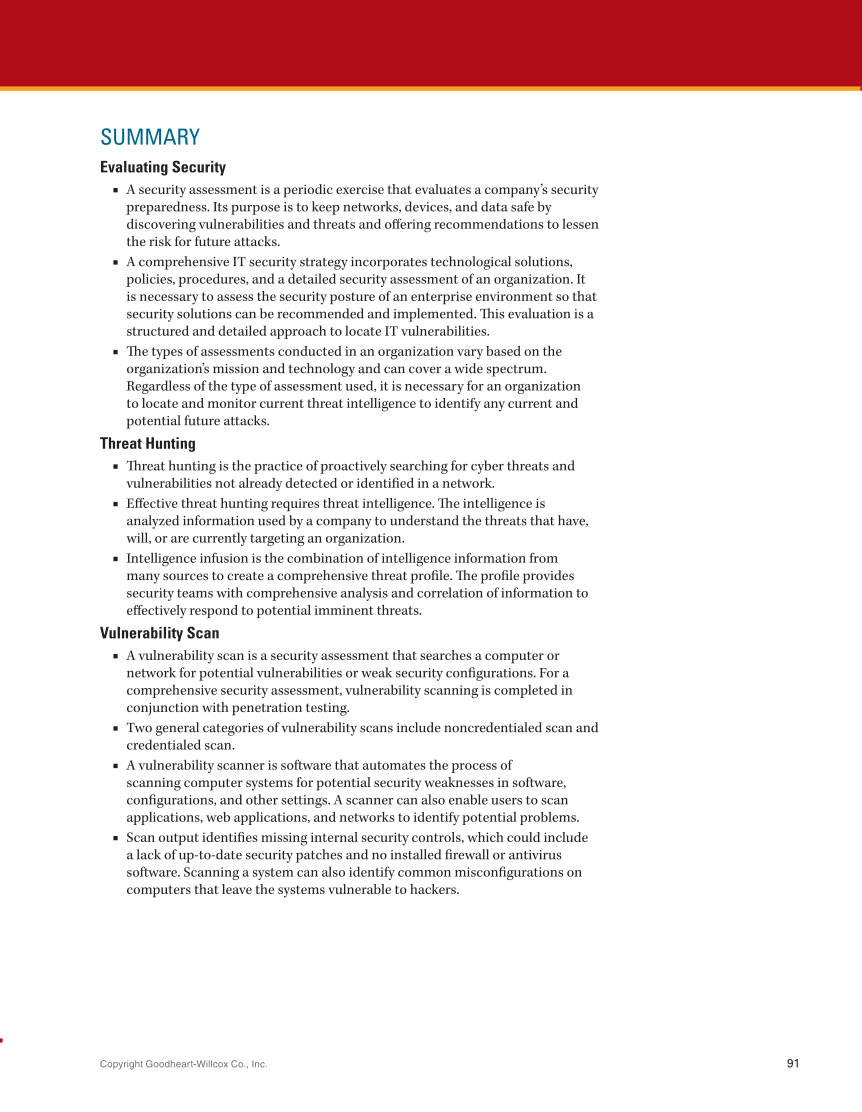 Copyright Goodheart-Willcox Co., Inc. 91 SUMMARY Evaluating Security ■ ■ A security assessment is a periodic exercise that evaluates a company’s security preparedness. Its purpose is to keep networks, devices, and data safe by discovering vulnerabilities and threats and offering recommendations to lessen the risk for future attacks. ■ ■ A comprehensive IT security strategy incorporates technological solutions, policies, procedures, and a detailed security assessment of an organization. It is necessary to assess the security posture of an enterprise environment so that security solutions can be recommended and implemented. This evaluation is a structured and detailed approach to locate IT vulnerabilities. ■ ■ The types of assessments conducted in an organization vary based on the organization’s mission and technology and can cover a wide spectrum. Regardless of the type of assessment used, it is necessary for an organization to locate and monitor current threat intelligence to identify any current and potential future attacks. Threat Hunting ■ ■ Threat hunting is the practice of proactively searching for cyber threats and vulnerabilities not already detected or identified in a network. ■ ■ Effective threat hunting requires threat intelligence. The intelligence is analyzed information used by a company to understand the threats that have, will, or are currently targeting an organization. ■ ■ Intelligence infusion is the combination of intelligence information from many sources to create a comprehensive threat profile. The profile provides security teams with comprehensive analysis and correlation of information to effectively respond to potential imminent threats. Vulnerability Scan ■ ■ A vulnerability scan is a security assessment that searches a computer or network for potential vulnerabilities or weak security configurations. For a comprehensive security assessment, vulnerability scanning is completed in conjunction with penetration testing. ■ ■ Two general categories of vulnerability scans include noncredentialed scan and credentialed scan. ■ ■ A vulnerability scanner is software that automates the process of scanning computer systems for potential security weaknesses in software, configurations, and other settings. A scanner can also enable users to scan applications, web applications, and networks to identify potential problems. ■ ■ Scan output identifies missing internal security controls, which could include a lack of up-to-date security patches and no installed firewall or antivirus software. Scanning a system can also identify common misconfigurations on computers that leave the systems vulnerable to hackers.