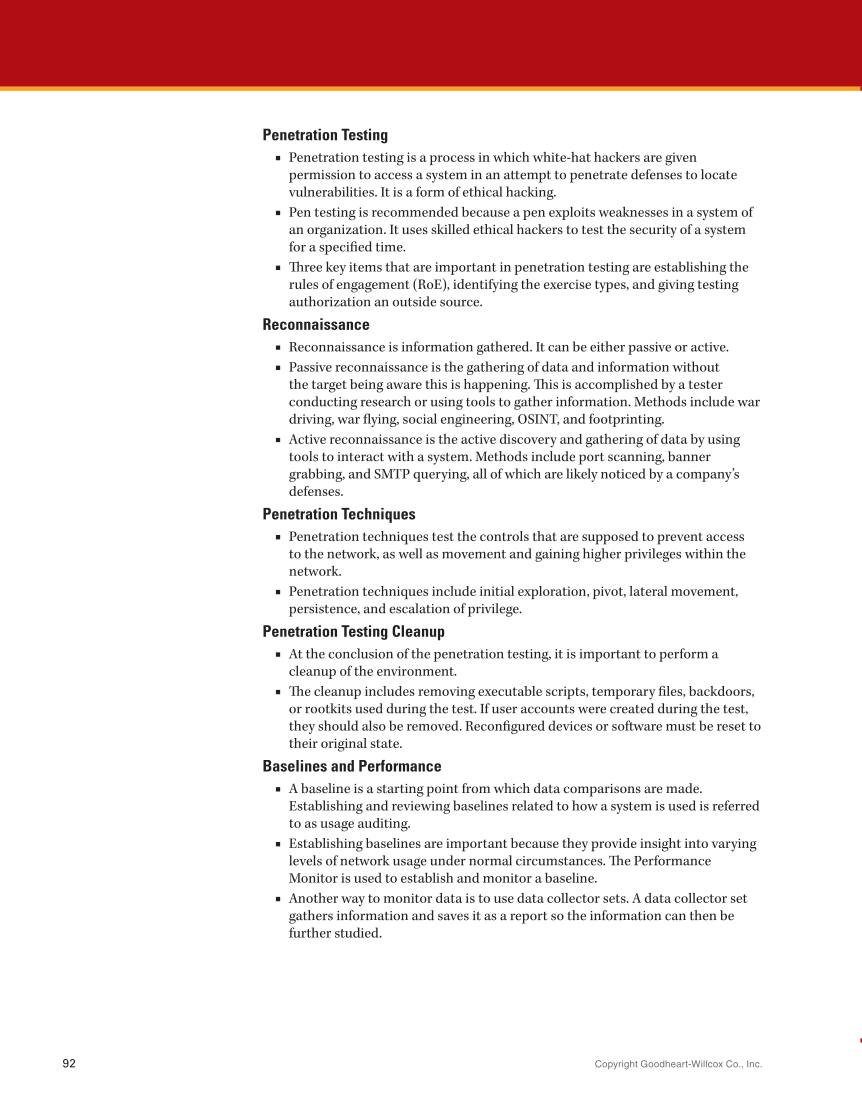 Copyright Goodheart-Willcox Co., Inc. 92 Penetration Testing ■ ■ Penetration testing is a process in which white-hat hackers are given permission to access a system in an attempt to penetrate defenses to locate vulnerabilities. It is a form of ethical hacking. ■ ■ Pen testing is recommended because a pen exploits weaknesses in a system of an organization. It uses skilled ethical hackers to test the security of a system for a specified time. ■ ■ Three key items that are important in penetration testing are establishing the rules of engagement (RoE), identifying the exercise types, and giving testing authorization an outside source. Reconnaissance■ ■■ Reconnaissance is information gathered. It can be either passive or active. ■ Passive reconnaissance is the gathering of data and information without the target being aware this is happening. This is accomplished by a tester conducting research or using tools to gather information. Methods include war driving, war flying, social engineering, OSINT, and footprinting. ■ ■ Active reconnaissance is the active discovery and gathering of data by using tools to interact with a system. Methods include port scanning, banner grabbing, and SMTP querying, all of which are likely noticed by a company’s defenses. Penetration Techniques ■ ■ Penetration techniques test the controls that are supposed to prevent access to the network, as well as movement and gaining higher privileges within the network. ■ ■ Penetration techniques include initial exploration, pivot, lateral movement, persistence, and escalation of privilege. Penetration Testing Cleanup ■ ■ At the conclusion of the penetration testing, it is important to perform a cleanup of the environment. ■ ■ The cleanup includes removing executable scripts, temporary files, backdoors, or rootkits used during the test. If user accounts were created during the test, they should also be removed. Reconfigured devices or software must be reset to their original state. Baselines and Performance ■ ■ A baseline is a starting point from which data comparisons are made. Establishing and reviewing baselines related to how a system is used is referred to as usage auditing. ■ ■ Establishing baselines are important because they provide insight into varying levels of network usage under normal circumstances. The Performance Monitor is used to establish and monitor a baseline. ■ ■ Another way to monitor data is to use data collector sets. A data collector set gathers information and saves it as a report so the information can then be further studied.