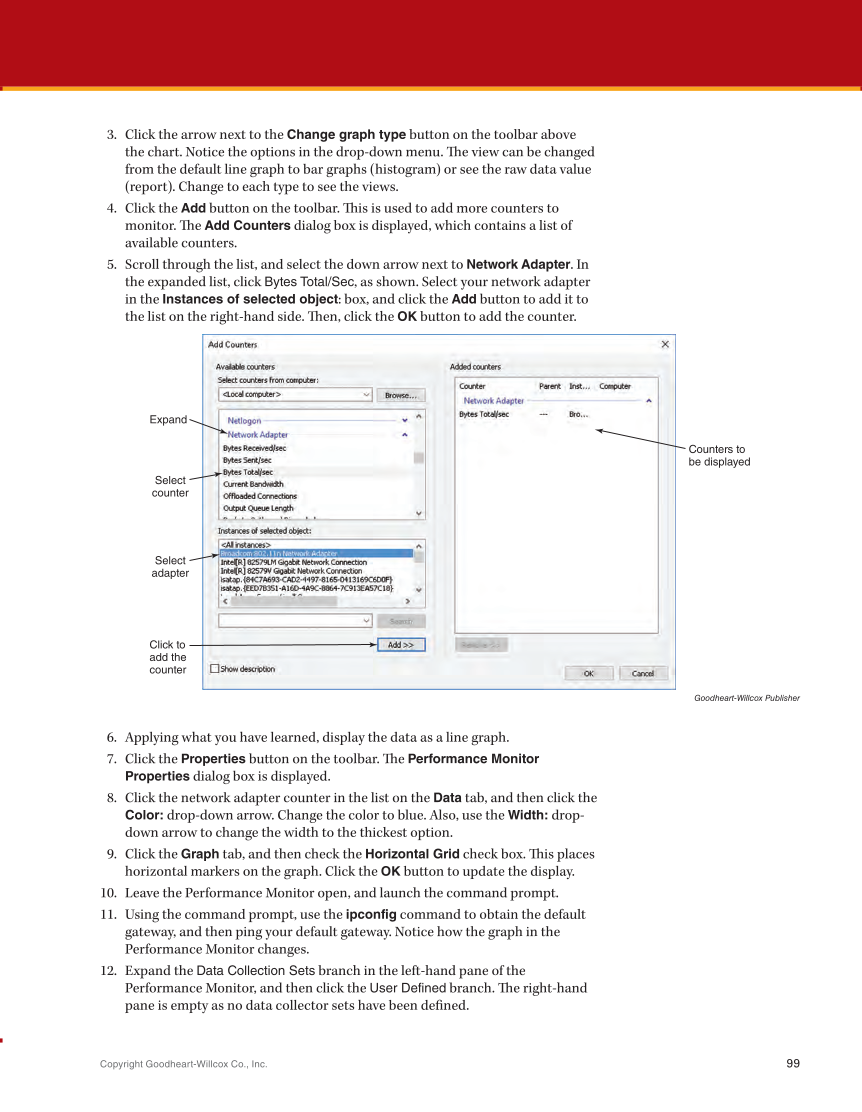 Copyright Goodheart-Willcox Co., Inc. 99 3. Click the arrow next to the Change graph type button on the toolbar above the chart. Notice the options in the drop-down menu. The view can be changed from the default line graph to bar graphs (histogram) or see the raw data value (report). Change to each type to see the views. 4. Click the Add button on the toolbar. This is used to add more counters to monitor. The Add Counters dialog box is displayed, which contains a list of available counters. 5. Scroll through the list, and select the down arrow next to Network Adapter. In the expanded list, click Bytes Total/Sec, as shown. Select your network adapter in the Instances of selected object: box, and click the Add button to add it to the list on the right-hand side. Then, click the OK button to add the counter. 6. Applying what you have learned, display the data as a line graph. 7. Click the Properties button on the toolbar. The Performance Monitor Properties dialog box is displayed. 8. Click the network adapter counter in the list on the Data tab, and then click the Color: drop-down arrow. Change the color to blue. Also, use the Width: drop- down arrow to change the width to the thickest option. 9. Click the Graph tab, and then check the Horizontal Grid check box. This places horizontal markers on the graph. Click the OK button to update the display. 10. Leave the Performance Monitor open, and launch the command prompt. 11. Using the command prompt, use the ipconfig command to obtain the default gateway, and then ping your default gateway. Notice how the graph in the Performance Monitor changes. 12. Expand the Data Collection Sets branch in the left-hand pane of the Performance Monitor, and then click the User Defined branch. The right-hand pane is empty as no data collector sets have been defined. Click to add the counter Expand Select counter Select adapter Counters to be displayed Goodheart-Willcox Publisher