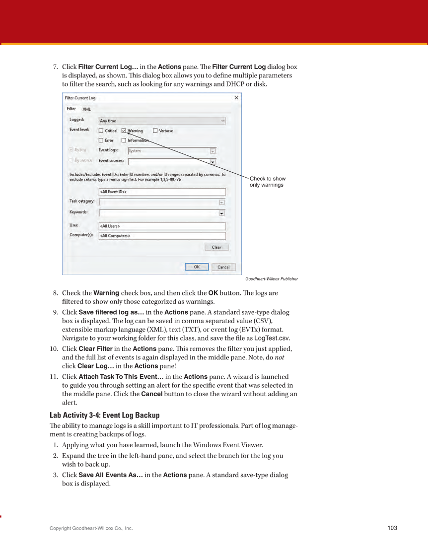 Copyright Goodheart-Willcox Co., Inc. 103 7. Click Filter Current Log… in the Actions pane. The Filter Current Log dialog box is displayed, as shown. This dialog box allows you to define multiple parameters to filter the search, such as looking for any warnings and DHCP or disk. 8. Check the Warning check box, and then click the OK button. The logs are filtered to show only those categorized as warnings. 9. Click Save filtered log as… in the Actions pane. A standard save-type dialog box is displayed. The log can be saved in comma separated value (CSV), extensible markup language (XML), text (TXT), or event log (EVTx) format. Navigate to your working folder for this class, and save the file as LogTest.csv. 10. Click Clear Filter in the Actions pane. This removes the filter you just applied, and the full list of events is again displayed in the middle pane. Note, do not click Clear Log… in the Actions pane! 11. Click Attach Task To This Event… in the Actions pane. A wizard is launched to guide you through setting an alert for the specific event that was selected in the middle pane. Click the Cancel button to close the wizard without adding an alert. Lab Activity 3-4: Event Log Backup The ability to manage logs is a skill important to IT professionals. Part of log manage- ment is creating backups of logs. 1. Applying what you have learned, launch the Windows Event Viewer. 2. Expand the tree in the left-hand pane, and select the branch for the log you wish to back up. 3. Click Save All Events As… in the Actions pane. A standard save-type dialog box is displayed. Check to show only warnings Goodheart-Willcox Publisher