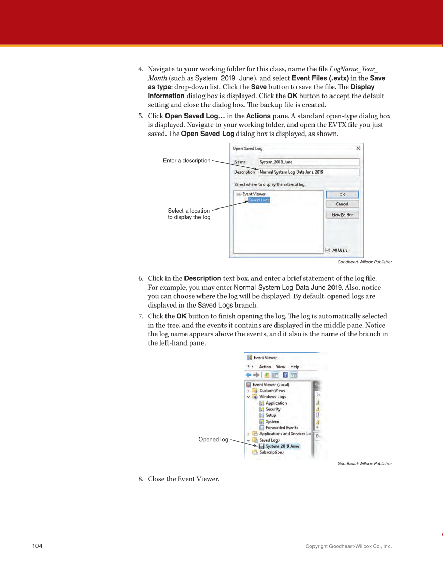 Copyright Goodheart-Willcox Co., Inc. 104 4. Navigate to your working folder for this class, name the file LogName_Year_ Month (such as System_2019_June), and select Event Files (.evtx) in the Save as type: drop-down list. Click the Save button to save the file. The Display Information dialog box is displayed. Click the OK button to accept the default setting and close the dialog box. The backup file is created. 5. Click Open Saved Log… in the Actions pane. A standard open-type dialog box is displayed. Navigate to your working folder, and open the EVTX file you just saved. The Open Saved Log dialog box is displayed, as shown. 6. Click in the Description text box, and enter a brief statement of the log file. For example, you may enter Normal System Log Data June 2019. Also, notice you can choose where the log will be displayed. By default, opened logs are displayed in the Saved Logs branch. 7. Click the OK button to finish opening the log. The log is automatically selected in the tree, and the events it contains are displayed in the middle pane. Notice the log name appears above the events, and it also is the name of the branch in the left-hand pane. 8. Close the Event Viewer. Enter a description Select a location to display the log Opened log Goodheart-Willcox Publisher Goodheart-Willcox Publisher