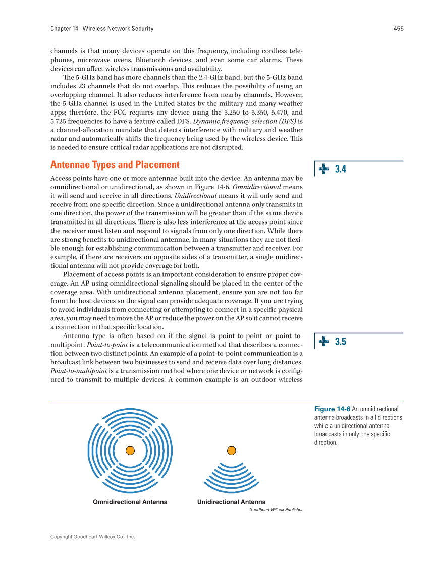 Copyright Goodheart-Willcox Co., Inc. 455 Chapter 14 Wireless Network Security channels is that many devices operate on this frequency, including cordless tele- phones, microwave ovens, Bluetooth devices, and even some car alarms. These devices can affect wireless transmissions and availability. The 5-GHz band has more channels than the 2.4-GHz band, but the 5-GHz band includes 23 channels that do not overlap. This reduces the possibility of using an overlapping channel. It also reduces interference from nearby channels. However, the 5-GHz channel is used in the United States by the military and many weather apps therefore, the FCC requires any device using the 5.250 to 5.350, 5.470, and 5.725 frequencies to have a feature called DFS. Dynamic frequency selection (DFS) is a channel-allocation mandate that detects interference with military and weather radar and automatically shifts the frequency being used by the wireless device. This is needed to ensure critical radar applications are not disrupted. Antennae Types and Placement Access points have one or more antennae built into the device. An antenna may be omnidirectional or unidirectional, as shown in Figure 14-6. Omnidirectional means it will send and receive in all directions. Unidirectional means it will only send and receive from one specific direction. Since a unidirectional antenna only transmits in one direction, the power of the transmission will be greater than if the same device transmitted in all directions. There is also less interference at the access point since the receiver must listen and respond to signals from only one direction. While there are strong benefits to unidirectional antennae, in many situations they are not flexi- ble enough for establishing communication between a transmitter and receiver. For example, if there are receivers on opposite sides of a transmitter, a single unidirec- tional antenna will not provide coverage for both. Placement of access points is an important consideration to ensure proper cov- erage. An AP using omnidirectional signaling should be placed in the center of the coverage area. With unidirectional antenna placement, ensure you are not too far from the host devices so the signal can provide adequate coverage. If you are trying to avoid individuals from connecting or attempting to connect in a specific physical area, you may need to move the AP or reduce the power on the AP so it cannot receive a connection in that specific location. Antenna type is often based on if the signal is point-to-point or point-to- multipoint. Point-to-point is a telecommunication method that describes a connec- tion between two distinct points. An example of a point-to-point communication is a broadcast link between two businesses to send and receive data over long distances. Point-to-multipoint is a transmission method where one device or network is config- ured to transmit to multiple devices. A common example is an outdoor wireless 3.4 3.5 Unidirectional Antenna Omnidirectional Antenna Goodheart-Willcox Publisher Figure 14-6 An omnidirectional antenna broadcasts in all directions, while a unidirectional antenna broadcasts in only one specific direction.