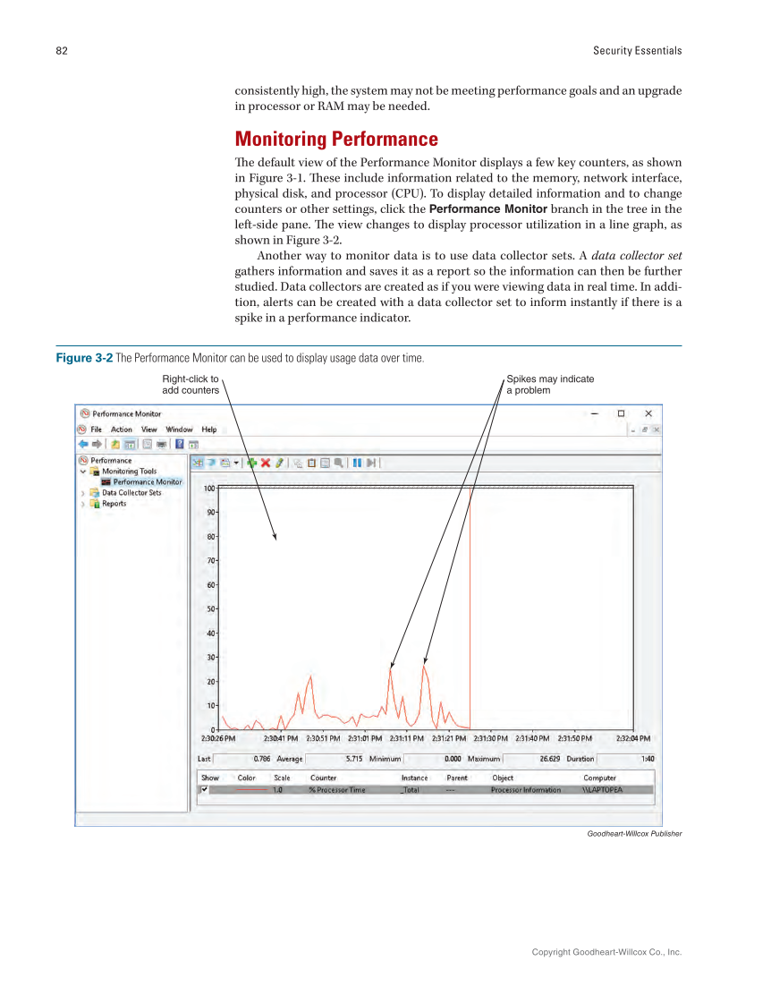 Copyright Goodheart-Willcox Co., Inc. 82 Security Essentials consistently high, the system may not be meeting performance goals and an upgrade in processor or RAM may be needed. Monitoring Performance The default view of the Performance Monitor displays a few key counters, as shown in Figure 3-1. These include information related to the memory, network interface, physical disk, and processor (CPU). To display detailed information and to change counters or other settings, click the Performance Monitor branch in the tree in the left-side pane. The view changes to display processor utilization in a line graph, as shown in Figure 3-2. Another way to monitor data is to use data collector sets. A data collector set gathers information and saves it as a report so the information can then be further studied. Data collectors are created as if you were viewing data in real time. In addi- tion, alerts can be created with a data collector set to inform instantly if there is a spike in a performance indicator. Spikes may indicate a problem Right-click to add counters Goodheart-Willcox Publisher Figure 3-2 The Performance Monitor can be used to display usage data over time.