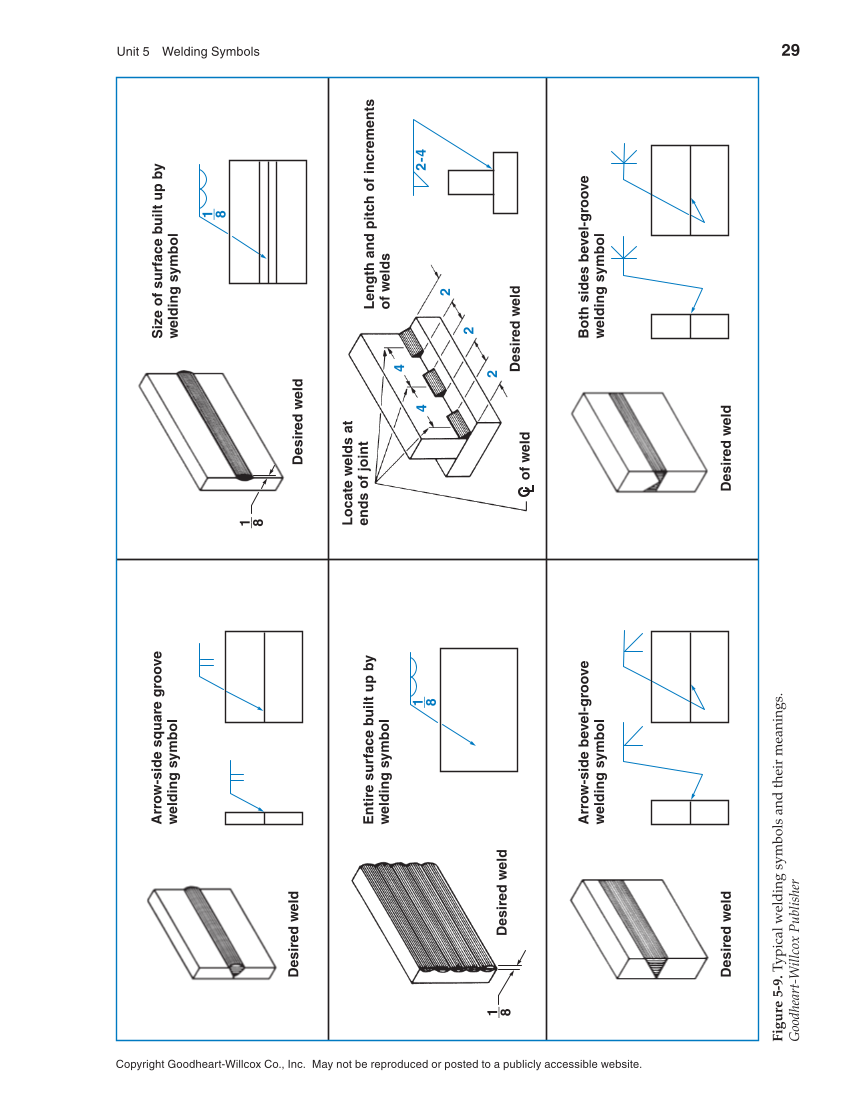 Unit 5 Welding Symbols 29 Copyright Goodheart-Willcox Co., Inc. May not be reproduced or posted to a publicly accessible website. Figure 5-9. Typical welding symbols and their meanings. Goodheart-Willcox Publisher Desired weld Arrow-side square groove welding symbol Entire surface built up by welding symbol Arrow-side bevel-groove welding symbol Both sides bevel-groove welding symbol Length and pitch of increments of welds Locate welds at ends of joint Size of surface built up by welding symbol Desired weld Desired weld Desired weld Desired weld of weld Desired weld 2-4 2 2 2 4 4