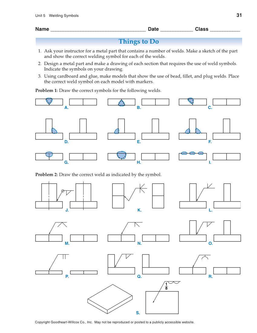 Unit 5 Welding Symbols 31 Copyright Goodheart-Willcox Co., Inc. May not be reproduced or posted to a publicly accessible website. Name ______________________________________ Date _____________ Class ____________ Things to Do 1. Ask your instructor for a metal part that contains a number of welds. Make a sketch of the part and show the correct welding symbol for each of the welds. 2. Design a metal part and make a drawing of each section that requires the use of weld symbols. Indicate the symbols on your drawing. 3. Using cardboard and glue, make models that show the use of bead, fi llet, and plug welds. Place the correct weld symbol on each model with markers. Problem 1: Draw the correct symbols for the following welds. A. B. C. D. E. F. G. H. I. Problem 2: Draw the correct weld as indicated by the symbol. J. K. L. M. N. O. P. Q. S. R.