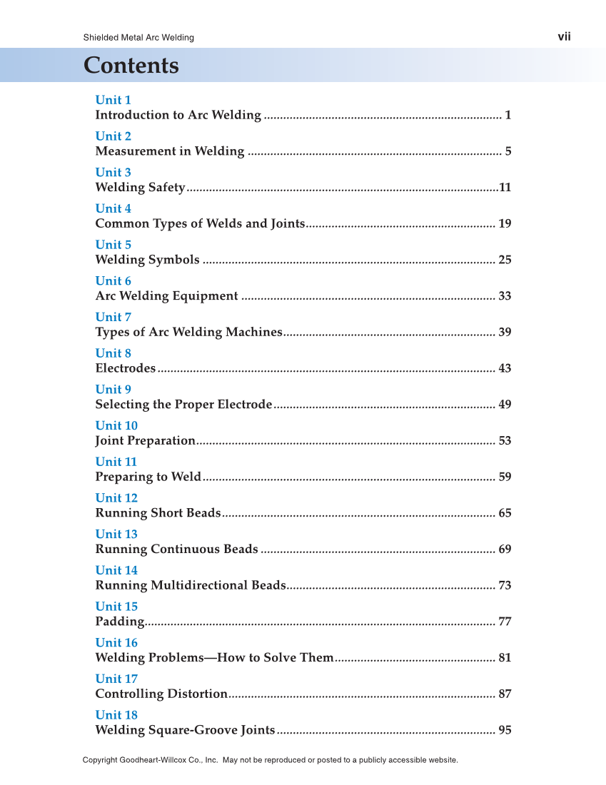 Shielded Metal Arc Welding vii Copyright Goodheart-Willcox Co., Inc. May not be reproduced or posted to a publicly accessible website. Contents Unit 1 Introduction to Arc Welding .......................................................................... 1 Unit 2 Measurement in Welding ............................................................................... 5 Unit 3 Welding Safety .................................................................................................11 Unit 4 Common Types of Welds and Joints ........................................................... 19 Unit 5 Welding Symbols ........................................................................................... 25 Unit 6 Arc Welding Equipment ............................................................................... 33 Unit 7 Types of Arc Welding Machines .................................................................. 39 Unit 8 Electrodes ......................................................................................................... 43 Unit 9 Selecting the Proper Electrode ..................................................................... 49 Unit 10 Joint Preparation ............................................................................................. 53 Unit 11 Preparing to Weld ........................................................................................... 59 Unit 12 Running Short Beads ..................................................................................... 65 Unit 13 Running Continuous Beads ......................................................................... 69 Unit 14 Running Multidirectional Beads................................................................. 73 Unit 15 Padding............................................................................................................. 77 Unit 16 Welding Problems—How to Solve Them .................................................. 81 Unit 17 Controlling Distortion ................................................................................... 87 Unit 18 Welding Square-Groove Joints .................................................................... 95