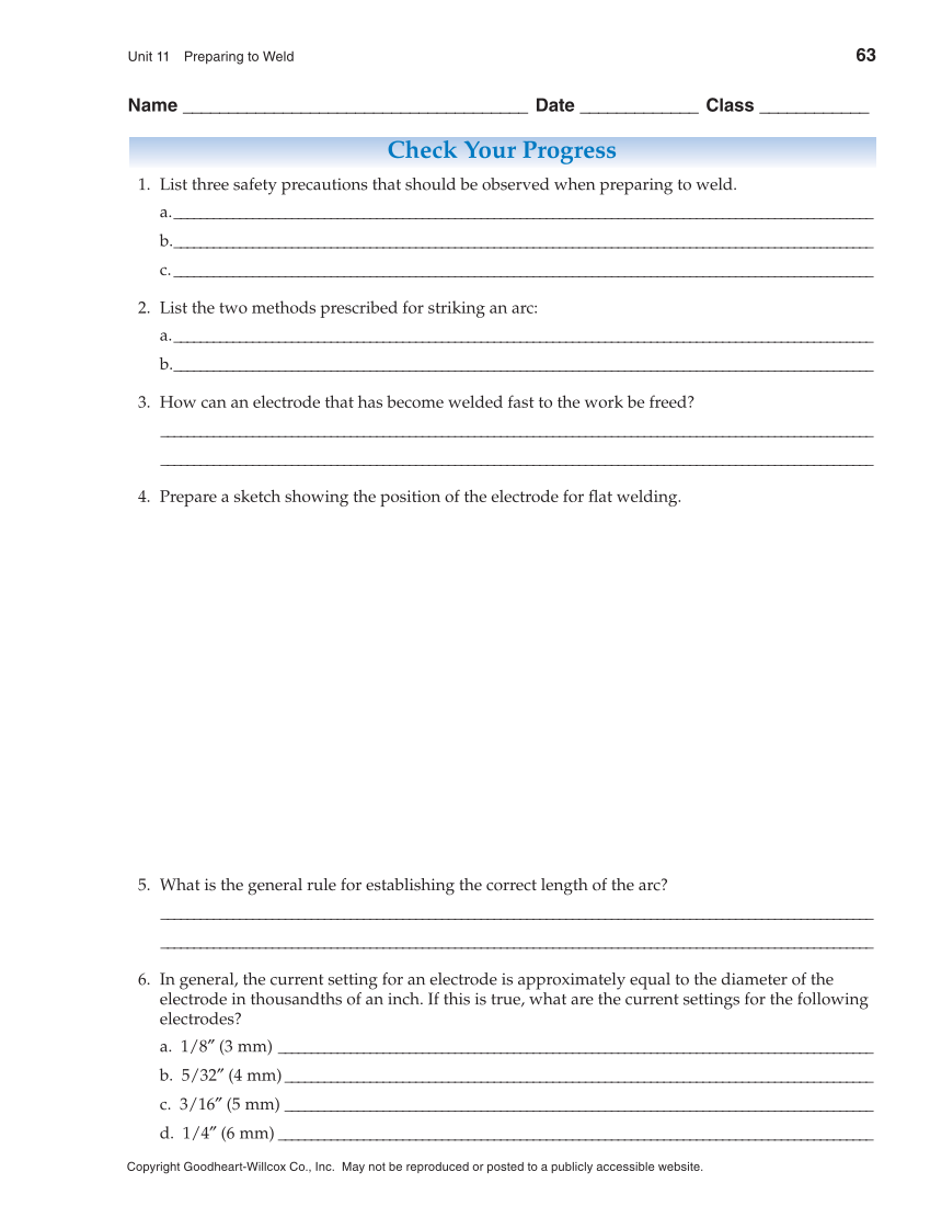 Unit 11 Preparing to Weld 63 Copyright Goodheart-Willcox Co., Inc. May not be reproduced or posted to a publicly accessible website. Name ______________________________________ Date _____________ Class ____________ Check Your Progress 1. List three safety precautions that should be observed when preparing to weld. a. ___________________________________________________________________________________________________________ b. ___________________________________________________________________________________________________________ c. ___________________________________________________________________________________________________________ 2. List the two methods prescribed for striking an arc: a. ___________________________________________________________________________________________________________ b. ___________________________________________________________________________________________________________ 3. How can an electrode that has become welded fast to the work be freed? _____________________________________________________________________________________________________________ _____________________________________________________________________________________________________________ 4. Prepare a sketch showing the position of the electrode for fl at welding. 5. What is the general rule for establishing the correct length of the arc? _____________________________________________________________________________________________________________ _____________________________________________________________________________________________________________ 6. In general, the current setting for an electrode is approximately equal to the diameter of the electrode in thousandths of an inch. If this is true, what are the current settings for the following electrodes? a. 1/8″ (3 mm) ___________________________________________________________________________________________ b. 5/32″ (4 mm) __________________________________________________________________________________________ c. 3/16″ (5 mm) __________________________________________________________________________________________ d. 1/4″ (6 mm) ___________________________________________________________________________________________