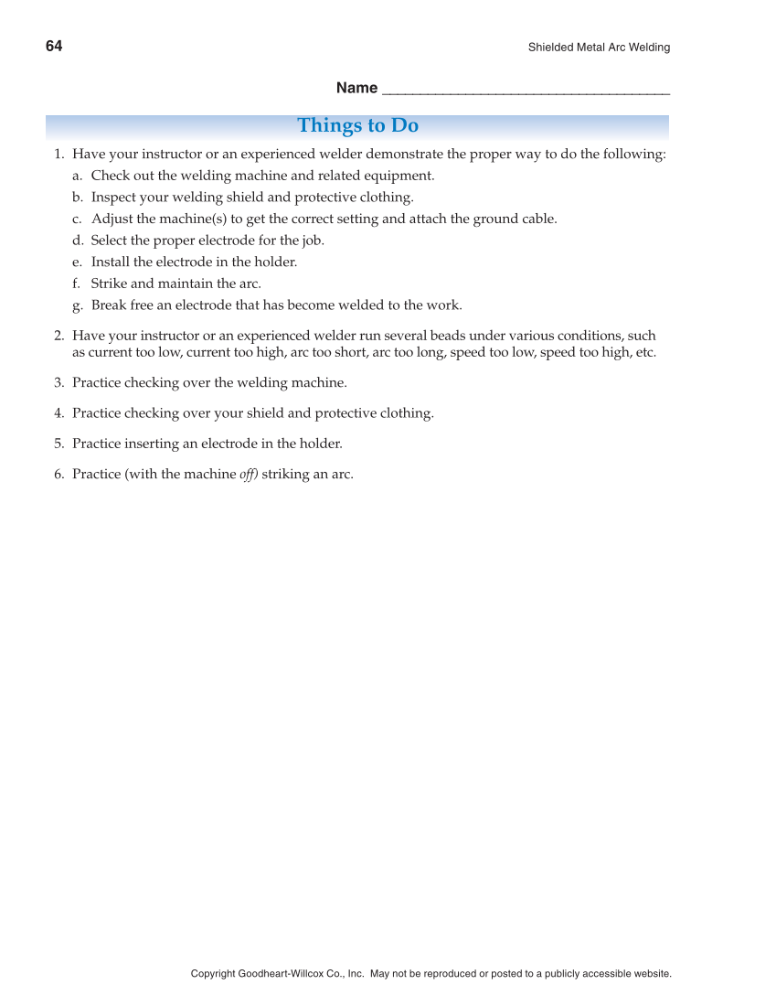 64 Shielded Metal Arc Welding Copyright Goodheart-Willcox Co., Inc. May not be reproduced or posted to a publicly accessible website. Name ______________________________________ Things to Do 1. Have your instructor or an experienced welder demonstrate the proper way to do the following: a. Check out the welding machine and related equipment. b. Inspect your welding shield and protective clothing. c. Adjust the machine(s) to get the correct setting and attach the ground cable. d. Select the proper electrode for the job. e. Install the electrode in the holder. f. Strike and maintain the arc. g. Break free an electrode that has become welded to the work. 2. Have your instructor or an experienced welder run several beads under various conditions, such as current too low, current too high, arc too short, arc too long, speed too low, speed too high, etc. 3. Practice checking over the welding machine. 4. Practice checking over your shield and protective clothing. 5. Practice inserting an electrode in the holder. 6. Practice (with the machine off) striking an arc.