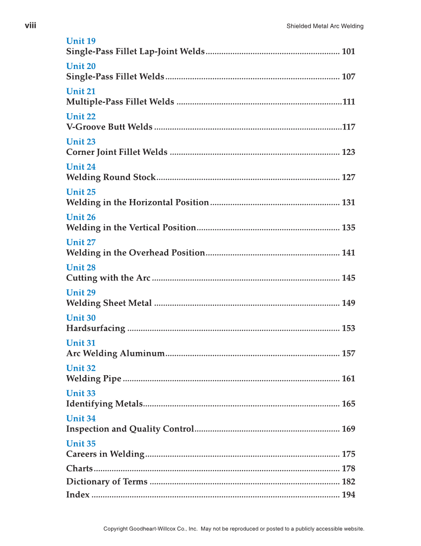 viii Shielded Metal Arc Welding Copyright Goodheart-Willcox Co., Inc. May not be reproduced or posted to a publicly accessible website. Unit 19 Single-Pass Fillet Lap-Joint Welds ............................................................ 101 Unit 20 Single-Pass Fillet Welds .............................................................................. 107 Unit 21 Multiple-Pass Fillet Welds ..........................................................................111 Unit 22 V-Groove Butt Welds ....................................................................................117 Unit 23 Corner Joint Fillet Welds ............................................................................ 123 Unit 24 Welding Round Stock .................................................................................. 127 Unit 25 Welding in the Horizontal Position .......................................................... 131 Unit 26 Welding in the Vertical Position ................................................................ 135 Unit 27 Welding in the Overhead Position ............................................................ 141 Unit 28 Cutting with the Arc .................................................................................... 145 Unit 29 Welding Sheet Metal ................................................................................... 149 Unit 30 Hardsurfacing ............................................................................................... 153 Unit 31 Arc Welding Aluminum .............................................................................. 157 Unit 32 Welding Pipe ................................................................................................. 161 Unit 33 Identifying Metals........................................................................................ 165 Unit 34 Inspection and Quality Control ................................................................. 169 Unit 35 Careers in Welding ....................................................................................... 175 Charts .............................................................................................................. 178 Dictionary of Terms ..................................................................................... 182 Index ............................................................................................................... 194