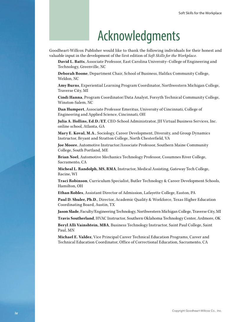 Copyright Goodheart-Willcox Co., Inc. iv Soft Skills for the Workplace Acknowledgments Goodheart-Willcox Publisher would like to thank the following individuals for their honest and valuable input in the development of the first edition of Soft Skills for the Workplace. David L. Batts, Associate Professor, East Carolina University–College of Engineering and Technology, Greenville, NC Deborah Boone, Department Chair, School of Business, Halifax Community College, Weldon, NC Amy Burns, Experiential Learning Program Coordinator, Northwestern Michigan College, Traverse City, MI Cindi Hanna, Program Coordinator/Data Analyst, Forsyth Technical Community College, Winston-Salem, NC Dan Humpert, Associate Professor Emeritus, University of Cincinnati, College of Engineering and Applied Science, Cincinnati, OH Julia A. Hollins, Ed.D./ET, CEO-School Administrator, JH Virtual Business Services, Inc. online school, Atlanta, GA Mary E. Koval, M.A., Sociology, Career Development, Diversity, and Group Dynamics Instructor, Bryant and Stratton College, North Chesterfield, VA Joe Moore, Automotive Instructor/Associate Professor, Southern Maine Community College, South Portland, ME Brian Noel, Automotive Mechanics Technology Professor, Cosumnes River College, Sacramento, CA Micheal L. Randolph, MS, RMA, Instructor, Medical Assisting, Gateway Tech College, Racine, WI Traci Robinson, Curriculum Specialist, Butler Technology & Career Development Schools, Hamilton, OH Ethan Robles, Assistant Director of Admission, Lafayette College, Easton, PA Paul D. Shuler, Ph.D., Director, Academic Quality & Workforce, Texas Higher Education Coordinating Board, Austin, TX Jason Slade, Faculty/Engineering Technology, Northwestern Michigan College, Traverse City, MI Travis Southerland, HVAC Instructor, Southern Oklahoma Technology Center, Ardmore, OK Beryl Alli Vainshtein, MBA, Business Technology Instructor, Saint Paul College, Saint Paul, MN Michael E. Valdez, Vice Principal Career Technical Education Programs, Career and Technical Education Coordinator, Office of Correctional Education, Sacramento, CA