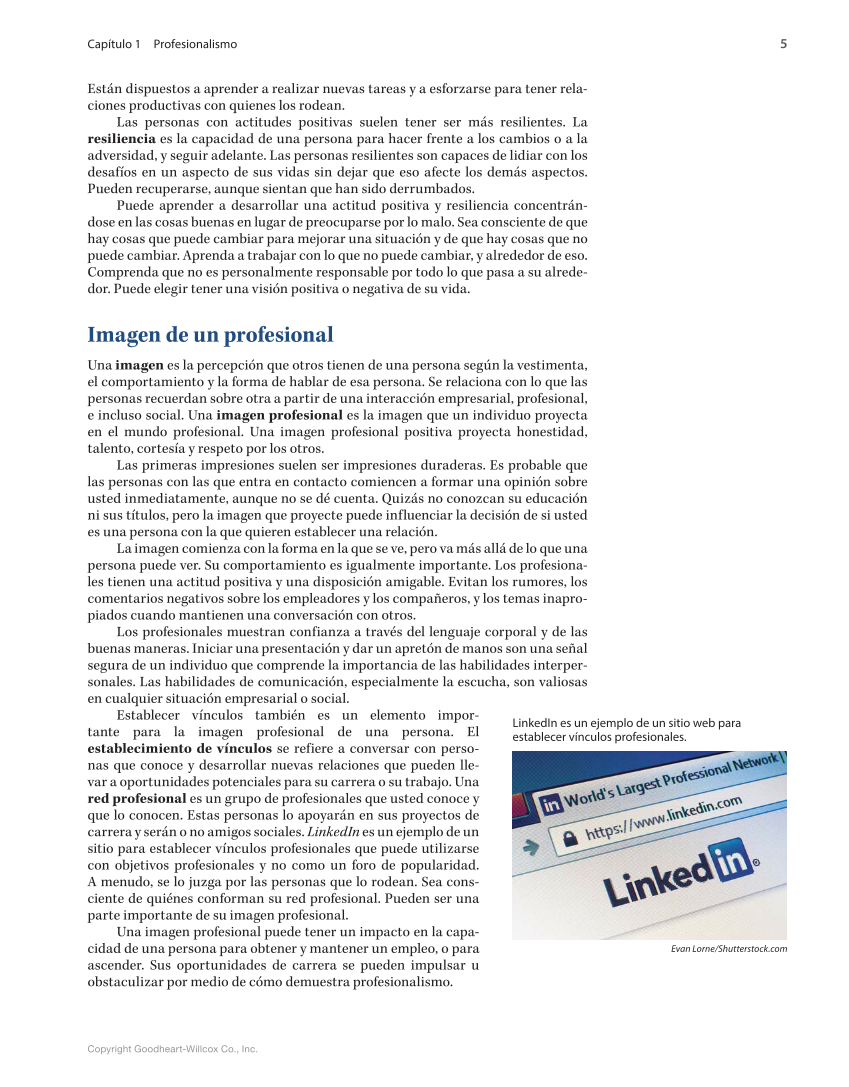 5 Capítulo 1 Profesionalismo Copyright Goodheart-Willcox Co., Inc. LinkedIn es un ejemplo de un sitio web para establecer vínculos profesionales. Evan Lorne/Shutterstock.com Están dispuestos a aprender a realizar nuevas tareas y a esforzarse para tener rela- ciones productivas con quienes los rodean. Las personas con actitudes positivas suelen tener ser más resilientes. La resiliencia es la capacidad de una persona para hacer frente a los cambios o a la adversidad, y seguir adelante. Las personas resilientes son capaces de lidiar con los desafíos en un aspecto de sus vidas sin dejar que eso afecte los demás aspectos. Pueden recuperarse, aunque sientan que han sido derrumbados. Puede aprender a desarrollar una actitud positiva y resiliencia concentrán- dose en las cosas buenas en lugar de preocuparse por lo malo. Sea consciente de que hay cosas que puede cambiar para mejorar una situación y de que hay cosas que no puede cambiar. Aprenda a trabajar con lo que no puede cambiar, y alrededor de eso. Comprenda que no es personalmente responsable por todo lo que pasa a su alrede- dor. Puede elegir tener una visión positiva o negativa de su vida. Imagen de un profesional Una imagen es la percepción que otros tienen de una persona según la vestimenta, el comportamiento y la forma de hablar de esa persona. Se relaciona con lo que las personas recuerdan sobre otra a partir de una interacción empresarial, profesional, e incluso social. Una imagen profesional es la imagen que un individuo proyecta en el mundo profesional. Una imagen profesional positiva proyecta honestidad, talento, cortesía y respeto por los otros. Las primeras impresiones suelen ser impresiones duraderas. Es probable que las personas con las que entra en contacto comiencen a formar una opinión sobre usted inmediatamente, aunque no se dé cuenta. Quizás no conozcan su educación ni sus títulos, pero la imagen que proyecte puede influenciar la decisión de si usted es una persona con la que quieren establecer una relación. La imagen comienza con la forma en la que se ve, pero va más allá de lo que una persona puede ver. Su comportamiento es igualmente importante. Los profesiona- les tienen una actitud positiva y una disposición amigable. Evitan los rumores, los comentarios negativos sobre los empleadores y los compañeros, y los temas inapro- piados cuando mantienen una conversación con otros. Los profesionales muestran confianza a través del lenguaje corporal y de las buenas maneras. Iniciar una presentación y dar un apretón de manos son una señal segura de un individuo que comprende la importancia de las habilidades interper- sonales. Las habilidades de comunicación, especialmente la escucha, son valiosas en cualquier situación empresarial o social. Establecer vínculos también es un elemento impor- tante para la imagen profesional de una persona. El establecimiento de vínculos se refiere a conversar con perso- nas que conoce y desarrollar nuevas relaciones que pueden lle- var a oportunidades potenciales para su carrera o su trabajo. Una red profesional es un grupo de profesionales que usted conoce y que lo conocen. Estas personas lo apoyarán en sus proyectos de carrera y serán o no amigos sociales. LinkedIn es un ejemplo de un sitio para establecer vínculos profesionales que puede utilizarse con objetivos profesionales y no como un foro de popularidad. A menudo, se lo juzga por las personas que lo rodean. Sea cons- ciente de quiénes conforman su red profesional. Pueden ser una parte importante de su imagen profesional. Una imagen profesional puede tener un impacto en la capa- cidad de una persona para obtener y mantener un empleo, o para ascender. Sus oportunidades de carrera se pueden impulsar u obstaculizar por medio de cómo demuestra profesionalismo.