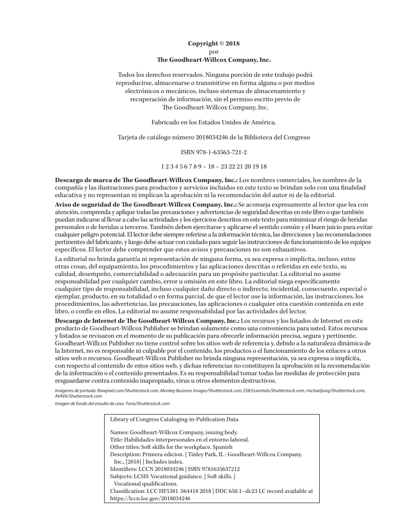 Copyright © 2018 por Th e Goodheart-Willcox Company, Inc. Todos los derechos reservados. Ninguna porción de este trabajo podrá reproducirse, almacenarse o transmitirse en forma alguna o por medios electrónicos o mecánicos, incluso sistemas de almacenamiento y recuperación de información, sin el permiso escrito previo de Th e Goodheart-Willcox Company, Inc. Fabricado en los Estados Unidos de América. Tarjeta de catálogo número 2018034246 de la Biblioteca del Congreso ISBN 978-1-63563-721-2 1 2 3 4 5 6 7 8 9 – 18 – 23 22 21 20 19 18 Descargo de marca de Th e Goodheart-Willcox Company, Inc.: Los nombres comerciales, los nombres de la compañía y las ilustraciones para productos y servicios incluidos en este texto se brindan solo con una fi nalidad educativa y no representan ni implican la aprobación ni la recomendación del autor ni de la editorial. Aviso de seguridad de Th e Goodheart-Willcox Company, Inc.: Se aconseja expresamente al lector que lea con atención, comprenda y aplique todas las precauciones y advertencias de seguridad descritas en este libro o que también puedan indicarse al llevar a cabo las actividades y los ejercicios descritos en este texto para minimizar el riesgo de heridas personales o de heridas a terceros. También deben ejercitarse y aplicarse el sentido común y el buen juicio para evitar cualquier peligro potencial. El lector debe siempre referirse a la información técnica, las direcciones y las recomendaciones pertinentes del fabricante, y luego debe actuar con cuidado para seguir las instrucciones de funcionamiento de los equipos específi cos. El lector debe comprender que estos avisos y precauciones no son exhaustivos. La editorial no brinda garantía ni representación de ninguna forma, ya sea expresa o implícita, incluso, entre otras cosas, del equipamiento, los procedimientos y las aplicaciones descritas o referidas en este texto, su calidad, desempeño, comerciabilidad o adecuación para un propósito particular. La editorial no asume responsabilidad por cualquier cambio, error u omisión en este libro. La editorial niega específi camente cualquier tipo de responsabilidad, incluso cualquier daño directo o indirecto, incidental, consecuente, especial o ejemplar, producto, en su totalidad o en forma parcial, de que el lector use la información, las instrucciones, los procedimientos, las advertencias, las precauciones, las aplicaciones o cualquier otra cuestión contenida en este libro, o confíe en ellos. La editorial no asume responsabilidad por las actividades del lector. Descargo de Internet de Th e Goodheart-Willcox Company, Inc.: Los recursos y los listados de Internet en este producto de Goodheart-Willcox Publisher se brindan solamente como una conveniencia para usted. Estos recursos y listados se revisaron en el momento de su publicación para ofrecerle información precisa, segura y pertinente. Goodheart-Willcox Publisher no tiene control sobre los sitios web de referencia y, debido a la naturaleza dinámica de la Internet, no es responsable ni culpable por el contenido, los productos o el funcionamiento de los enlaces a otros sitios web o recursos. Goodheart-Willcox Publisher no brinda ninguna representación, ya sea expresa o implícita, con respecto al contenido de estos sitios web, y dichas referencias no constituyen la aprobación ni la recomendación de la información o el contenido presentados. Es su responsabilidad tomar todas las medidas de protección para resguardarse contra contenido inapropiado, virus u otros elementos destructivos. Imágenes de portada: Rawpixel.com/Shutterstock.com, Monkey Business Images/Shutterstock.com, ESB Essentials/Shutterstock.com, michaeljung/Shutterstock.com, AVAVA/Shutterstock.com Imagen de fondo del estudio de caso: Toria/Shutterstock.com Library of Congress Cataloging-in-Publication Data Names: Goodheart-Willcox Company, issuing body. Title: Habilidades interpersonales en el entorno laboral. Other titles: Soft skills for the workplace. Spanish Description: Primera edicion. | Tinley Park, IL : Goodheart-Willcox Company, Inc., [2018] | Includes index. Identifi ers: LCCN 2018034246 | ISBN 9781635637212 Subjects: LCSH: Vocational guidance. | Soft skills. | Vocational qualifi cations. Classifi cation: LCC HF5381 .S64418 2018 | DDC 650.1--dc23 LC record available at https://lccn.loc.gov/2018034246