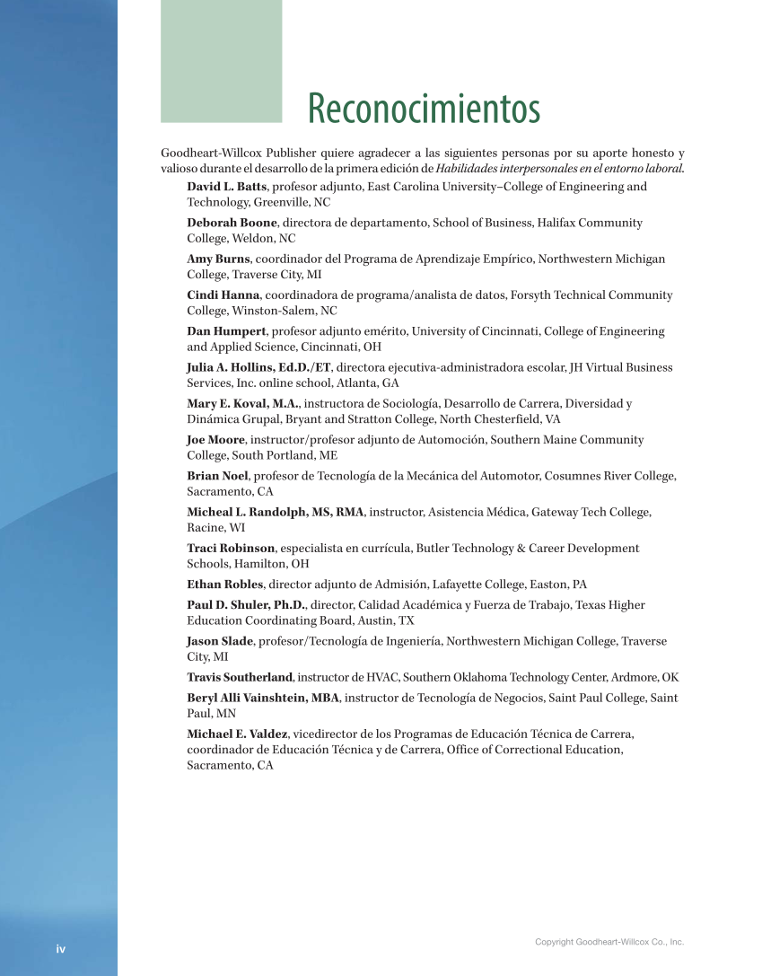 Copyright Goodheart-Willcox Co., Inc. iv Reconocimientos Goodheart-Willcox Publisher quiere agradecer a las siguientes personas por su aporte honesto y valioso durante el desarrollo de la primera edición de Habilidades interpersonales en el entorno laboral. David L. Batts, profesor adjunto, East Carolina University–College of Engineering and Technology, Greenville, NC Deborah Boone, directora de departamento, School of Business, Halifax Community College, Weldon, NC Amy Burns, coordinador del Programa de Aprendizaje Empírico, Northwestern Michigan College, Traverse City, MI Cindi Hanna, coordinadora de programa/analista de datos, Forsyth Technical Community College, Winston-Salem, NC Dan Humpert, profesor adjunto emérito, University of Cincinnati, College of Engineering and Applied Science, Cincinnati, OH Julia A. Hollins, Ed.D./ET, directora ejecutiva-administradora escolar, JH Virtual Business Services, Inc. online school, Atlanta, GA Mary E. Koval, M.A., instructora de Sociología, Desarrollo de Carrera, Diversidad y Dinámica Grupal, Bryant and Stratton College, North Chesterfield, VA Joe Moore, instructor/profesor adjunto de Automoción, Southern Maine Community College, South Portland, ME Brian Noel, profesor de Tecnología de la Mecánica del Automotor, Cosumnes River College, Sacramento, CA Micheal L. Randolph, MS, RMA, instructor, Asistencia Médica, Gateway Tech College, Racine, WI Traci Robinson, especialista en currícula, Butler Technology & Career Development Schools, Hamilton, OH Ethan Robles, director adjunto de Admisión, Lafayette College, Easton, PA Paul D. Shuler, Ph.D., director, Calidad Académica y Fuerza de Trabajo, Texas Higher Education Coordinating Board, Austin, TX Jason Slade, profesor/Tecnología de Ingeniería, Northwestern Michigan College, Traverse City, MI Travis Southerland, instructor de HVAC, Southern Oklahoma Technology Center, Ardmore, OK Beryl Alli Vainshtein, MBA, instructor de Tecnología de Negocios, Saint Paul College, Saint Paul, MN Michael E. Valdez, vicedirector de los Programas de Educación Técnica de Carrera, coordinador de Educación Técnica y de Carrera, Office of Correctional Education, Sacramento, CA