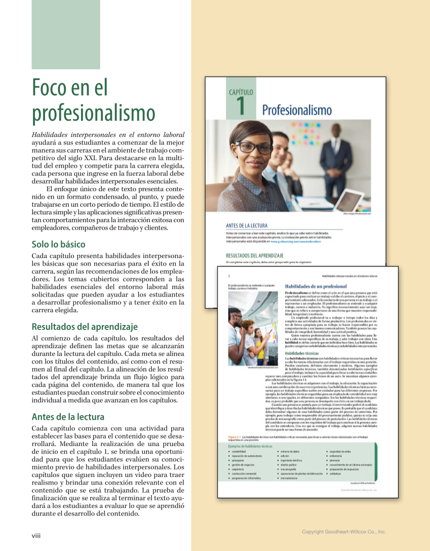 Copyright Goodheart-Willcox Co., Inc. viii Foco en el profesionalismo Habilidades interpersonales en el entorno laboral ayudará a sus estudiantes a comenzar de la mejor manera sus carreras en el ambiente de trabajo com- petitivo del siglo XXI. Para destacarse en la multi- tud del empleo y competir para la carrera elegida, cada persona que ingrese en la fuerza laboral debe desarrollar habilidades interpersonales esenciales. El enfoque único de este texto presenta conte- nido en un formato condensado, al punto, y puede trabajarse en un corto período de tiempo. El estilo de lectura simple y las aplicaciones significativas presen- tan comportamientos para la interacción exitosa con empleadores, compañeros de trabajo y clientes. Solo lo básico Cada capítulo presenta habilidades interpersona- les básicas que son necesarias para el éxito en la carrera, según las recomendaciones de los emplea- dores. Los temas cubiertos corresponden a las habilidades esenciales del entorno laboral más solicitadas que pueden ayudar a los estudiantes a desarrollar profesionalismo y a tener éxito en la carrera elegida. Resultados del aprendizaje Al comienzo de cada capítulo, los resultados del aprendizaje definen las metas que se alcanzarán durante la lectura del capítulo. Cada meta se alinea con los títulos del contenido, así como con el resu- men al final del capítulo. La alineación de los resul- tados del aprendizaje brinda un flujo lógico para cada página del contenido, de manera tal que los estudiantes puedan construir sobre el conocimiento individual a medida que avanzan en los capítulos. Antes de la lectura Cada capítulo comienza con una actividad para establecer las bases para el contenido que se desa- rrollará. Mediante la realización de una prueba de inicio en el capítulo 1, se brinda una oportuni- dad para que los estudiantes evalúen su conoci- miento previo de habilidades interpersonales. Los capítulos que siguen incluyen un video para traer realismo y brindar una conexión relevante con el contenido que se está trabajando. La prueba de finalización que se realiza al terminar el texto ayu- dará a los estudiantes a evaluar lo que se aprendió durante el desarrollo del contenido.