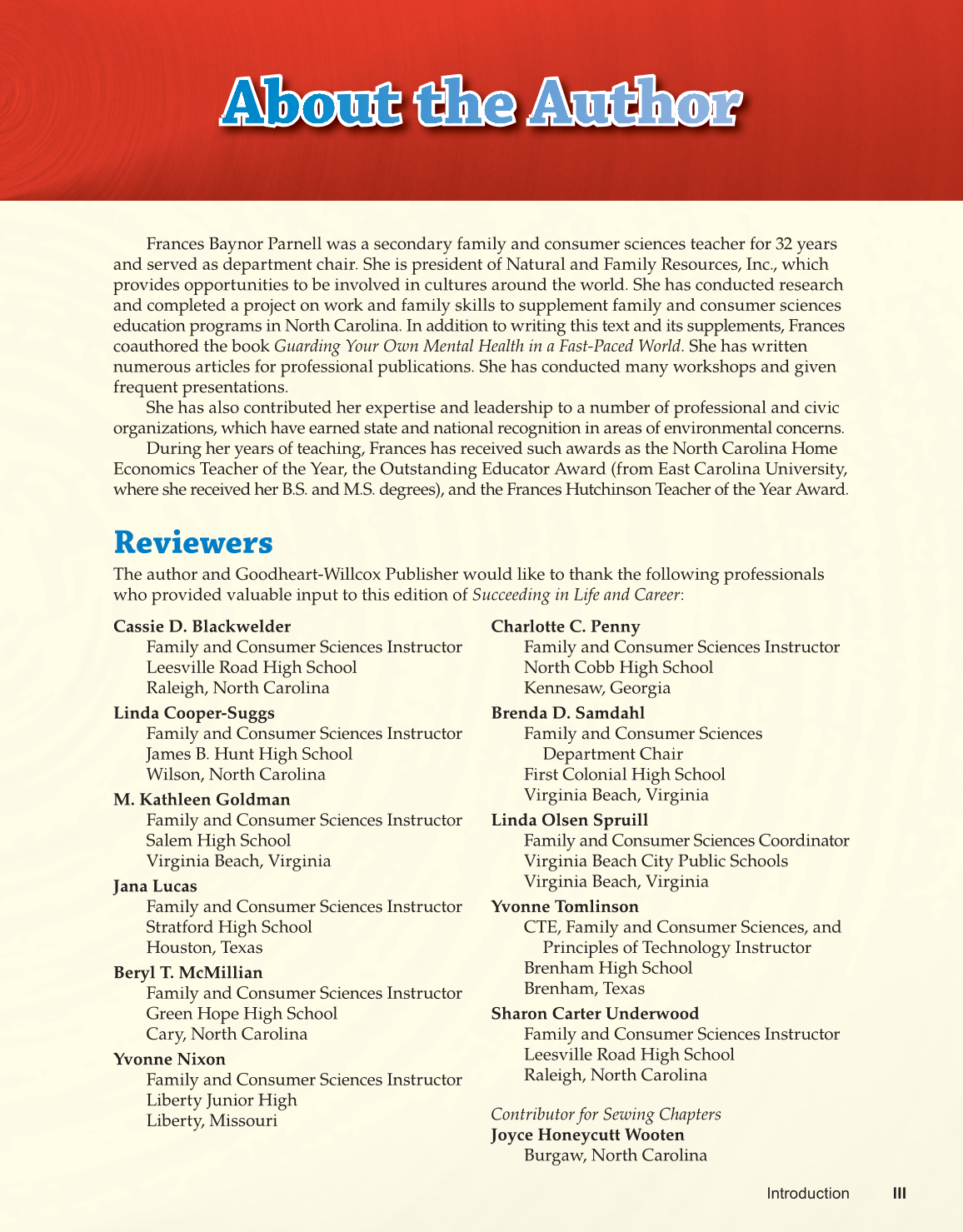 education programs in North Carolina. In addition to writing this text and its supplements, Frances