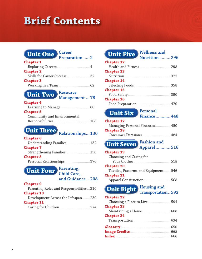 x Unit One Unit One Chapter 1 Exploring Careers ..................................4 Chapter 2 Skills for Career Success ........................32 Chapter 3 Working in a Team ................................62 Unit Two Unit Two Chapter 4 Learning to Manage ..............................80 Chapter 5 Community and Environmental Responsibilities .....................................108 Unit Th ree Unit Th ree Chapter 6 Understanding Families ........................132 Chapter 7 Strengthening Families .........................150 Chapter 8 Personal Relationships .........................176 Unit Four Unit Four Chapter 9 Parenting Roles and Responsibilities ...210 Chapter 10 Development Across the Lifespan ........230 Chapter 11 Caring for Children ...............................274 Career Preparation .....2 Resource Management ...78 Relationships ...130 Parenting, Child Care, and Guidance ...208 Unit Five Unit Five Chapter 12 Health and Fitness ................................298 Chapter 13 Nutrition ...............................................322 Chapter 14 Selecting Foods .....................................358 Chapter 15 Food Safety ............................................390 Chapter 16 Food Preparation ..................................420 Unit Six Unit Six Chapter 17 Managing Personal Finances ................450 Chapter 18 Consumer Decisions .............................484 Unit Seven Unit Seven Chapter 19 Choosing and Caring for Your Clothes ......................................518 Chapter 20 Textiles, Patterns, and Equipment .......546 Chapter 21 Apparel Construction ...........................568 Unit Eight Unit Eight Chapter 22 Choosing a Place to Live .......................594 Chapter 23 Maintaining a Home .............................608 Chapter 24 Transportation ......................................634 Glossary ...................................................650 Image Credits ..........................................665 Index .........................................................666 Wellness and Nutrition .........296 Personal Finance ............448 Fashion and Apparel ............516 Housing and Transportation ..592