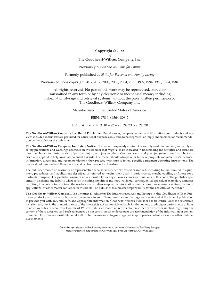 Copyright © 2022 by The Goodheart-Willcox Company, Inc. Previously published as Skills for Living Formerly published as Skills for Personal and Family Living Previous editions copyright 2017, 2012, 2008, 2006, 2004, 2001, 1997, 1994, 1988, 1984, 1981 All rights reserved. No part of this work may be reproduced, stored, or transmitted in any form or by any electronic or mechanical means, including information storage and retrieval systems, without the prior written permission of The Goodheart-Willcox Company, Inc. Manufactured in the United States of America. ISBN: 978-1-64564-806-2 1 2 3 4 5 6 7 8 9 10 – 22 – 25 24 23 22 21 20 The Goodheart-Willcox Company, Inc. Brand Disclaimer: Brand names, company names, and illustrations for products and ser- vices included in this text are provided for educational purposes only and do not represent or imply endorsement or recommenda- tion by the author or the publisher. The Goodheart-Willcox Company, Inc. Safety Notice: The reader is expressly advised to carefully read, understand, and apply all safety precautions and warnings described in this book or that might also be indicated in undertaking the activities and exercises described herein to minimize risk of personal injury or injury to others. Common sense and good judgment should also be exer- cised and applied to help avoid all potential hazards. The reader should always refer to the appropriate manufacturer’s technical information, directions, and recommendations then proceed with care to follow specific equipment operating instructions. The reader should understand these notices and cautions are not exhaustive. The publisher makes no warranty or representation whatsoever, either expressed or implied, including but not limited to equip- ment, procedures, and applications described or referred to herein, their quality, performance, merchantability, or fitness for a particular purpose. The publisher assumes no responsibility for any changes, errors, or omissions in this book. The publisher spe- cifically disclaims any liability whatsoever, including any direct, indirect, incidental, consequential, special, or exemplary damages resulting, in whole or in part, from the reader’s use or reliance upon the information, instructions, procedures, warnings, cautions, applications, or other matter contained in this book. The publisher assumes no responsibility for the activities of the reader. The Goodheart-Willcox Company, Inc. Internet Disclaimer: The Internet resources and listings in this Goodheart-Willcox Pub- lisher product are provided solely as a convenience to you. These resources and listings were reviewed at the time of publication to provide you with accurate, safe, and appropriate information. Goodheart-Willcox Publisher has no control over the referenced websites and, due to the dynamic nature of the Internet, is not responsible or liable for the content, products, or performance of links to other websites or resources. Goodheart-Willcox Publisher makes no representation, either expressed or implied, regarding the content of these websites, and such references do not constitute an endorsement or recommendation of the information or content presented. It is your responsibility to take all protective measures to guard against inappropriate content, viruses, or other destruc- tive elements. Cover Images (front and back cover from top to bottom): aldomurillo/E+/Getty Images monkeybusinessimages/iStock/Getty Images Plus AJ Watt/E+/Getty Images