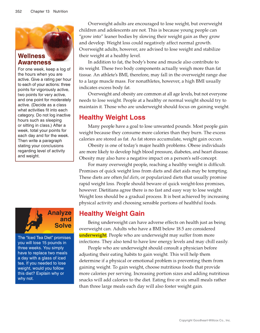 352 Chapter 13 Nutrition Copyright Goodheart-Willcox Co., Inc. Overweight adults are encouraged to lose weight, but overweight children and adolescents are not. This is because young people can “grow into” leaner bodies by slowing their weight gain as they grow and develop. Weight loss could negatively affect normal growth. Overweight adults, however, are advised to lose weight and stabilize their weight at a healthy level. In addition to fat, the body’s bone and muscle also contribute to its weight. These two body components actually weigh more than fat tissue. An athlete’s BMI, therefore, may fall in the overweight range due to a large muscle mass. For nonathletes, however, a high BMI usually indicates excess body fat. Overweight and obesity are common at all age levels, but not everyone needs to lose weight. People at a healthy or normal weight should try to maintain it. Those who are underweight should focus on gaining weight. Healthy Weight Loss Many people have a goal to lose unwanted pounds. Most people gain weight because they consume more calories than they burn. The excess calories are stored as fat. As fat stores accumulate, weight gain occurs. Obesity is one of today’s major health problems. Obese individuals are more likely to develop high blood pressure, diabetes, and heart disease. Obesity may also have a negative impact on a person’s self-concept. For many overweight people, reaching a healthy weight is diffi cult. Promises of quick weight loss from diets and diet aids may be tempting. These diets are often fad diets, or popularized diets that usually promise rapid weight loss. People should beware of quick weight-loss promises, however. Dietitians agree there is no fast and easy way to lose weight. Weight loss should be a gradual process. It is best achieved by increasing physical activity and choosing sensible portions of healthful foods. Healthy Weight Gain Being underweight can have adverse effects on health just as being overweight can. Adults who have a BMI below 18.5 are considered underweight. People who are underweight may suffer from more infections. They also tend to have low energy levels and may chill easily. People who are underweight should consult a physician before adjusting their eating habits to gain weight. This will help them determine if a physical or emotional problem is preventing them from gaining weight. To gain weight, choose nutritious foods that provide more calories per serving. Increasing portion sizes and adding nutritious snacks will add calories to the diet. Eating fi ve or six small meals rather than three large meals each day will also foster weight gain. For one week, keep a log of the hours when you are active. Give a rating per hour to each of your actions: three points for vigorously active, two points for very active, and one point for moderately active. (Decide as a class what activities fit into each category. Do not log inactive hours such as sleeping or sitting in class.) After a week, total your points for each day and for the week. Then write a paragraph stating your conclusions regarding level of activity and weight. Wellness Awareness Analyze and Solve The “Iced Tea Diet” promises you will lose 15 pounds in three weeks. You simply have to replace two meals a day with a glass of iced tea. If you needed to lose weight, would you follow this diet? Explain why or why not.