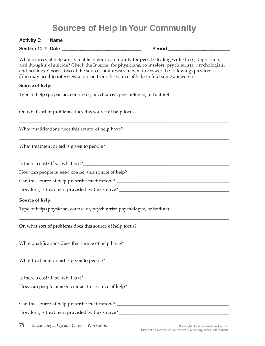 78 Succeeding in Life and Career Workbook Copyright Goodheart-Willcox Co., Inc. May not be reproduced or posted to a publicly accessible website. Sources of Help in Your Community Activity C Name______________________________________________ Section 12-2 Date_ ___________________________________ Period____________________________ What sources of help are available in your community for people dealing with stress, depression, and thoughts of suicide? Check the Internet for physicians, counselors, psychiatrists, psychologists, and hotlines. Choose two of the sources and research them to answer the following questions. (You may need to interview a person from the source of help to find some answers.) Source of help: Type of help (physician, counselor, psychiatrist, psychologist, or hotline): _________________________________________________________________________________________________________ On what sort of problems does this source of help focus? _________________________________________________________________________________________________________ What qualifications does this source of help have? _________________________________________________________________________________________________________ What treatment or aid is given to people? _________________________________________________________________________________________________________ Is there a cost? If so, what is it?__________________________________________________________________________ How can people in need contact this source of help?____________________________________________________ Can this source of help prescribe medications?_ ________________________________________________________ How long is treatment provided by this source?________________________________________________________ Source of help: Type of help (physician, counselor, psychiatrist, psychologist, or hotline): _________________________________________________________________________________________________________ On what sort of problems does this source of help focus? _________________________________________________________________________________________________________ What qualifications does this source of help have? _________________________________________________________________________________________________________ What treatment or aid is given to people? _________________________________________________________________________________________________________ Is there a cost? If so, what is it?__________________________________________________________________________ How can people in need contact this source of help? _________________________________________________________________________________________________________ Can this source of help prescribe medications?_ ________________________________________________________ How long is treatment provided by this source?________________________________________________________