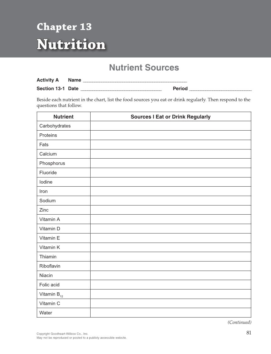 81 Copyright Goodheart-Willcox Co., Inc. May not be reproduced or posted to a publicly accessible website. Chapter 13 Nutrition Nutrient Sources Activity A Name______________________________________________ Section 13-1 Date_ ___________________________________ Period____________________________ Beside each nutrient in the chart, list the food sources you eat or drink regularly. Then respond to the questions that follow. Nutrient Sources I Eat or Drink Regularly Carbohydrates Proteins Fats Calcium Phosphorus Fluoride Iodine Iron Sodium Zinc Vitamin A Vitamin D Vitamin E Vitamin K Thiamin Riboflavin Niacin Folic acid Vitamin B 12 Vitamin C Water (Continued)